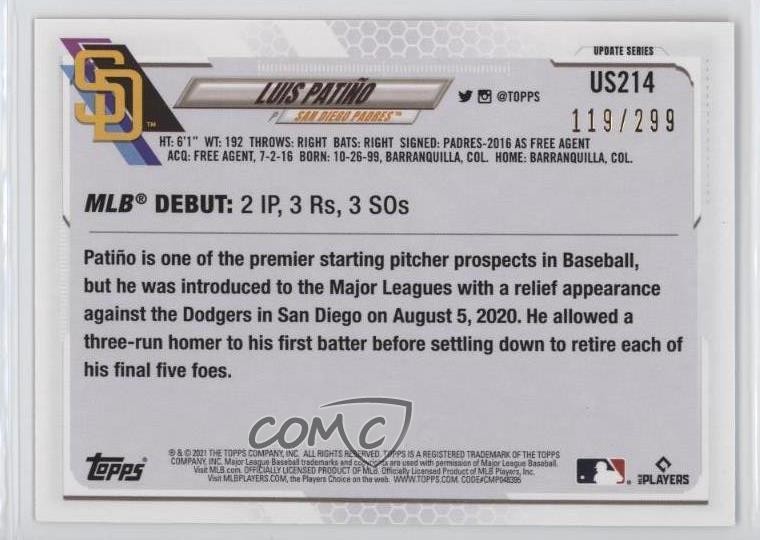 2021 Topps Update Series - [Base] - Orange Foil #US214 Rookie Debut - Luis Patino Qty Made: 299 - RC (Rookie Card) - Baseball Card - Featuring the San Diego Padres - Featuring Luis Patino Search for more: 2021 Topps Update Series Search for more: 2021 Topps Update Series - [Base] - Orange Foil View all of our Listings Auctions Buy It Now About Us Located in the beautiful Pacific Northwest, COMC (Check Out My Cards) is the world's largest consignment service for trading card singles. More than 10,000 people have used our consignment service to list over 50 million trading cards. Find out how we can help you consign your items on eBay by contacting us through eBay messaging. COMC -- "The Safe & Easy Way to Buy & Sell" Representative Image - Select Specific Item above to see image of actual item Representative Image - Select Specific Item above to see image of actual item Raw Condition for Modern Cards Unless otherwise noted, raw modern cards are listed in Near Mint-Mint condition or better. A NM-MT card appears to be Mint at first glance, but upon closer inspection, may exhibit some of the following: minor print defects (e.g. roller marks, print line, dimple), minor scratches, slight edge wear, and slight corner wear. Centering is clearly visible in the images provided and does not factor into our condition assessment. Raw Condition for Vintage Cards Unless otherwise noted, raw vintage cards are listed in Excellent condition or better. An EX card may exhibit some of the following: minor rounding of corners, surface wear, print defects, light scratches, and slight edge wear/chipping. Centering is clearly visible in the images provided and does not factor into our condition assessment. Domestic Shipping Combined shipping for multiple items is available. To receive combined shipping, please ensure all desired items are in your eBay shopping cart before proceeding to checkout. eBay limits orders to 40 items per order. We automatically combine multiple orders placed on the same day. If you place multiple orders on the same day, please contact us to request a refund of applicable shipping costs. Signature confirmation may be required on invoices over $400. All cards are protected and shipped securely. International Shipping COMC offers eBay's International Shipping (EIS) for international orders under $2,500* (see country exceptions below). All duties and import fees are paid at checkout; in the rare event that there are additional import fees upon delivery, these are borne by the buyer. EIS packages route through a shipping hub in Erlanger, KY before shipping to their final destination. Please note that EIS does not allow for combined shipments. The shipping rates are determined by eBay and cannot be adjusted. *Maximum sale price exceptions: Colombia, Kuwait ($2,000); Taiwan ($1,539); Chile, Costa Rica, Guatemala, Honduras, Trinidad and Tobago ($1,000); Antigua and Barbuda, Aruba, Belize, Dominica, Grenada, Philippines, Saint Kitts and Nevis, Saint Lucia, Montserrat, Turks and Caicos Islands ($500); Dominican Republic, El Salvador ($200). Please request a shipping quote through eBay messaging for orders that exceed the maximum sale price supported by eBay's International Shipping. You will be responsible for all duties and import fees for international orders shipped outside the EIS. All cards are protected and shipped securely. Payment COMC does not accept offers on our cards through our eBay storefront. COMC utilizes eBay’s managed payments system. If you are experiencing difficulties making a payment, please contact eBay for assistance. Return Policy Returns are only accepted on the rare occasion the item is not as described. If you are making a return, please initiate the return process through eBay so a mailing label can be provided for you. Prior to listing, our expert team carefully assessed this item to represent it accurately. Please review the description and high-definition images prior to purchasing to ensure this item meets your satisfaction. We welcome you to contact us if you have further questions about this item. Trust and Integrity COMC carefully assesses each item consigned to us to prevent fraudulent items from entering the marketplace. If you believe an item offered on COMC may be fraudulent, please contact us with details so we can investigate the issue. Items we determine are outside our supported items policy may be removed. Last Modified: 6/10/2025 8:23:59 PM PDT