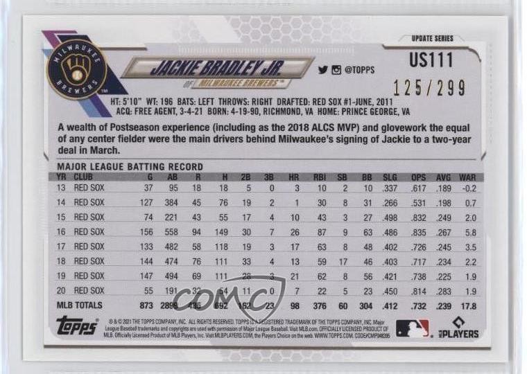 2021 Topps Update Series - [Base] - Orange Foil #US111 Jackie Bradley Jr. Qty Made: 299 - Baseball Card - Featuring the Milwaukee Brewers - Featuring Jackie Bradley Jr. Search for more: 2021 Topps Update Series Search for more: 2021 Topps Update Series - [Base] - Orange Foil View all of our Listings Auctions Buy It Now About Us Located in the beautiful Pacific Northwest, COMC (Check Out My Cards) is the world's largest consignment service for trading card singles. More than 10,000 people have used our consignment service to list over 50 million trading cards. Find out how we can help you consign your items on eBay by contacting us through eBay messaging. COMC -- "The Safe & Easy Way to Buy & Sell" Representative Image - Select Specific Item above to see image of actual item Representative Image - Select Specific Item above to see image of actual item Raw Condition for Modern Cards Unless otherwise noted, raw modern cards are listed in Near Mint-Mint condition or better. A NM-MT card appears to be Mint at first glance, but upon closer inspection, may exhibit some of the following: minor print defects (e.g. roller marks, print line, dimple), minor scratches, slight edge wear, and slight corner wear. Centering is clearly visible in the images provided and does not factor into our condition assessment. Raw Condition for Vintage Cards Unless otherwise noted, raw vintage cards are listed in Excellent condition or better. An EX card may exhibit some of the following: minor rounding of corners, surface wear, print defects, light scratches, and slight edge wear/chipping. Centering is clearly visible in the images provided and does not factor into our condition assessment. Domestic Shipping Combined shipping for multiple items is available. To receive combined shipping, please ensure all desired items are in your eBay shopping cart before proceeding to checkout. eBay limits orders to 40 items per order. We automatically combine multiple orders placed on the same day. If you place multiple orders on the same day, please contact us to request a refund of applicable shipping costs. Signature confirmation may be required on invoices over $400. All cards are protected and shipped securely. International Shipping COMC offers eBay's International Shipping (EIS) for international orders under $2,500* (see country exceptions below). All duties and import fees are paid at checkout; in the rare event that there are additional import fees upon delivery, these are borne by the buyer. EIS packages route through a shipping hub in Erlanger, KY before shipping to their final destination. Please note that EIS does not allow for combined shipments. The shipping rates are determined by eBay and cannot be adjusted. *Maximum sale price exceptions: Colombia, Kuwait ($2,000); Taiwan ($1,539); Chile, Costa Rica, Guatemala, Honduras, Trinidad and Tobago ($1,000); Antigua and Barbuda, Aruba, Belize, Dominica, Grenada, Philippines, Saint Kitts and Nevis, Saint Lucia, Montserrat, Turks and Caicos Islands ($500); Dominican Republic, El Salvador ($200). Please request a shipping quote through eBay messaging for orders that exceed the maximum sale price supported by eBay's International Shipping. You will be responsible for all duties and import fees for international orders shipped outside the EIS. All cards are protected and shipped securely. Payment COMC does not accept offers on our cards through our eBay storefront. COMC utilizes eBay’s managed payments system. If you are experiencing difficulties making a payment, please contact eBay for assistance. Return Policy Returns are only accepted on the rare occasion the item is not as described. If you are making a return, please initiate the return process through eBay so a mailing label can be provided for you. Prior to listing, our expert team carefully assessed this item to represent it accurately. Please review the description and high-definition images prior to purchasing to ensure this item meets your satisfaction. We welcome you to contact us if you have further questions about this item. Trust and Integrity COMC carefully assesses each item consigned to us to prevent fraudulent items from entering the marketplace. If you believe an item offered on COMC may be fraudulent, please contact us with details so we can investigate the issue. Items we determine are outside our supported items policy may be removed. Last Modified: 6/10/2025 8:16:35 PM PDT