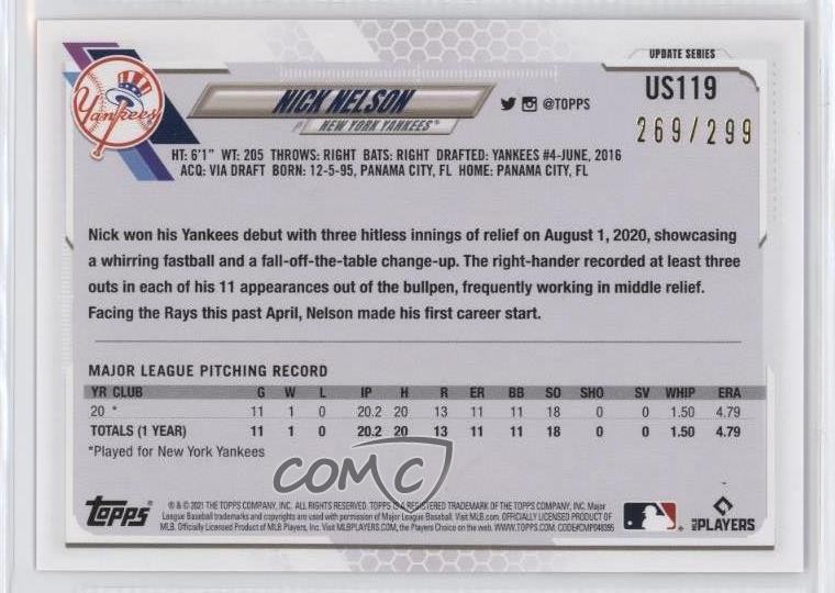 2021 Topps Update Series - [Base] - Orange Foil #US119 Nick Nelson Qty Made: 299 - RC (Rookie Card) - Baseball Card - Featuring the New York Yankees - Featuring Nick Nelson Search for more: 2021 Topps Update Series Search for more: 2021 Topps Update Series - [Base] - Orange Foil View all of our Listings Auctions Buy It Now About Us Located in the beautiful Pacific Northwest, COMC (Check Out My Cards) is the world's largest consignment service for trading card singles. More than 10,000 people have used our consignment service to list over 50 million trading cards. Find out how we can help you consign your items on eBay by contacting us through eBay messaging. COMC -- "The Safe & Easy Way to Buy & Sell" Representative Image - Select Specific Item above to see image of actual item Representative Image - Select Specific Item above to see image of actual item Raw Condition for Modern Cards Unless otherwise noted, raw modern cards are listed in Near Mint-Mint condition or better. A NM-MT card appears to be Mint at first glance, but upon closer inspection, may exhibit some of the following: minor print defects (e.g. roller marks, print line, dimple), minor scratches, slight edge wear, and slight corner wear. Centering is clearly visible in the images provided and does not factor into our condition assessment. Raw Condition for Vintage Cards Unless otherwise noted, raw vintage cards are listed in Excellent condition or better. An EX card may exhibit some of the following: minor rounding of corners, surface wear, print defects, light scratches, and slight edge wear/chipping. Centering is clearly visible in the images provided and does not factor into our condition assessment. Domestic Shipping Combined shipping for multiple items is available. To receive combined shipping, please ensure all desired items are in your eBay shopping cart before proceeding to checkout. eBay limits orders to 40 items per order. We automatically combine multiple orders placed on the same day. If you place multiple orders on the same day, please contact us to request a refund of applicable shipping costs. Signature confirmation may be required on invoices over $400. All cards are protected and shipped securely. International Shipping COMC offers eBay's International Shipping (EIS) for international orders under $2,500* (see country exceptions below). All duties and import fees are paid at checkout; in the rare event that there are additional import fees upon delivery, these are borne by the buyer. EIS packages route through a shipping hub in Erlanger, KY before shipping to their final destination. Please note that EIS does not allow for combined shipments. The shipping rates are determined by eBay and cannot be adjusted. *Maximum sale price exceptions: Colombia, Kuwait ($2,000); Taiwan ($1,539); Chile, Costa Rica, Guatemala, Honduras, Trinidad and Tobago ($1,000); Antigua and Barbuda, Aruba, Belize, Dominica, Grenada, Philippines, Saint Kitts and Nevis, Saint Lucia, Montserrat, Turks and Caicos Islands ($500); Dominican Republic, El Salvador ($200). Please request a shipping quote through eBay messaging for orders that exceed the maximum sale price supported by eBay's International Shipping. You will be responsible for all duties and import fees for international orders shipped outside the EIS. All cards are protected and shipped securely. Payment COMC does not accept offers on our cards through our eBay storefront. COMC utilizes eBay’s managed payments system. If you are experiencing difficulties making a payment, please contact eBay for assistance. Return Policy Returns are only accepted on the rare occasion the item is not as described. If you are making a return, please initiate the return process through eBay so a mailing label can be provided for you. Prior to listing, our expert team carefully assessed this item to represent it accurately. Please review the description and high-definition images prior to purchasing to ensure this item meets your satisfaction. We welcome you to contact us if you have further questions about this item. Trust and Integrity COMC carefully assesses each item consigned to us to prevent fraudulent items from entering the marketplace. If you believe an item offered on COMC may be fraudulent, please contact us with details so we can investigate the issue. Items we determine are outside our supported items policy may be removed. Last Modified: 6/10/2025 8:16:53 PM PDT