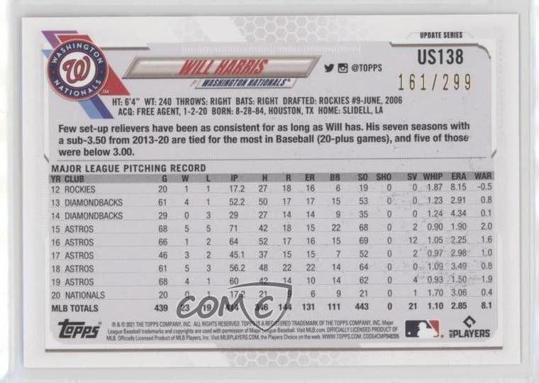 2021 Topps Update Series - [Base] - Orange Foil #US138 Will Harris Qty Made: 299 - Baseball Card - Featuring the Washington Nationals - Featuring Will Harris Search for more: 2021 Topps Update Series Search for more: 2021 Topps Update Series - [Base] - Orange Foil View all of our Listings Auctions Buy It Now About Us Located in the beautiful Pacific Northwest, COMC (Check Out My Cards) is the world's largest consignment service for trading card singles. More than 10,000 people have used our consignment service to list over 50 million trading cards. Find out how we can help you consign your items on eBay by contacting us through eBay messaging. COMC -- "The Safe & Easy Way to Buy & Sell" Representative Image - Select Specific Item above to see image of actual item Representative Image - Select Specific Item above to see image of actual item Raw Condition for Modern Cards Unless otherwise noted, raw modern cards are listed in Near Mint-Mint condition or better. A NM-MT card appears to be Mint at first glance, but upon closer inspection, may exhibit some of the following: minor print defects (e.g. roller marks, print line, dimple), minor scratches, slight edge wear, and slight corner wear. Centering is clearly visible in the images provided and does not factor into our condition assessment. Raw Condition for Vintage Cards Unless otherwise noted, raw vintage cards are listed in Excellent condition or better. An EX card may exhibit some of the following: minor rounding of corners, surface wear, print defects, light scratches, and slight edge wear/chipping. Centering is clearly visible in the images provided and does not factor into our condition assessment. Domestic Shipping Combined shipping for multiple items is available. To receive combined shipping, please ensure all desired items are in your eBay shopping cart before proceeding to checkout. eBay limits orders to 40 items per order. We automatically combine multiple orders placed on the same day. If you place multiple orders on the same day, please contact us to request a refund of applicable shipping costs. Signature confirmation may be required on invoices over $400. All cards are protected and shipped securely. International Shipping COMC offers eBay's International Shipping (EIS) for international orders under $2,500* (see country exceptions below). All duties and import fees are paid at checkout; in the rare event that there are additional import fees upon delivery, these are borne by the buyer. EIS packages route through a shipping hub in Erlanger, KY before shipping to their final destination. Please note that EIS does not allow for combined shipments. The shipping rates are determined by eBay and cannot be adjusted. *Maximum sale price exceptions: Colombia, Kuwait ($2,000); Taiwan ($1,539); Chile, Costa Rica, Guatemala, Honduras, Trinidad and Tobago ($1,000); Antigua and Barbuda, Aruba, Belize, Dominica, Grenada, Philippines, Saint Kitts and Nevis, Saint Lucia, Montserrat, Turks and Caicos Islands ($500); Dominican Republic, El Salvador ($200). Please request a shipping quote through eBay messaging for orders that exceed the maximum sale price supported by eBay's International Shipping. You will be responsible for all duties and import fees for international orders shipped outside the EIS. All cards are protected and shipped securely. Payment COMC does not accept offers on our cards through our eBay storefront. COMC utilizes eBay’s managed payments system. If you are experiencing difficulties making a payment, please contact eBay for assistance. Return Policy Returns are only accepted on the rare occasion the item is not as described. If you are making a return, please initiate the return process through eBay so a mailing label can be provided for you. Prior to listing, our expert team carefully assessed this item to represent it accurately. Please review the description and high-definition images prior to purchasing to ensure this item meets your satisfaction. We welcome you to contact us if you have further questions about this item. Trust and Integrity COMC carefully assesses each item consigned to us to prevent fraudulent items from entering the marketplace. If you believe an item offered on COMC may be fraudulent, please contact us with details so we can investigate the issue. Items we determine are outside our supported items policy may be removed. Last Modified: 6/10/2025 8:17:11 PM PDT