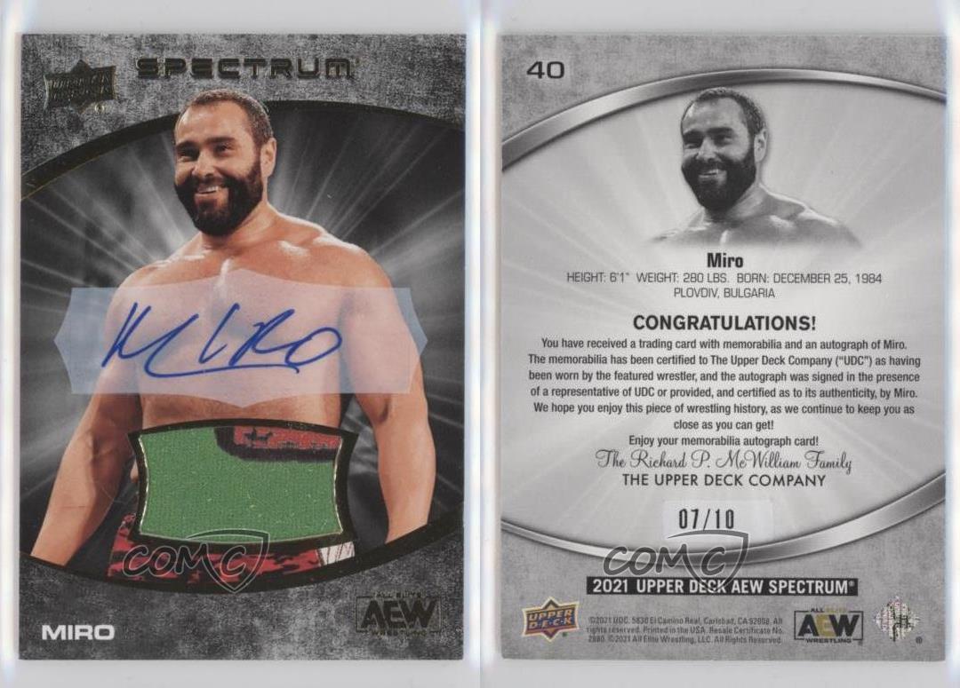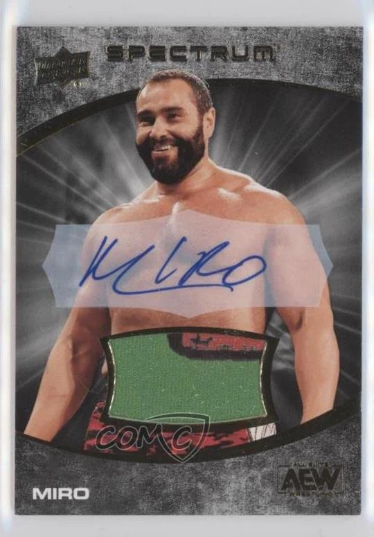 2021 Upper Deck AEW Spectrum - [Base] - Dark Memorabilia Autographs #40 Miro Qty Made: 10 - RC (Rookie Card) - Wrestling Card - Featuring Miro Search for more: 2021 Upper Deck AEW Spectrum Search for more: 2021 Upper Deck AEW Spectrum - [Base] - Dark Memorabilia Autographs View all of our Listings Auctions Buy It Now About Us Located in the beautiful Pacific Northwest, COMC (Check Out My Cards) is the world's largest consignment service for trading card singles. More than 10,000 people have used our consignment service to list over 50 million trading cards. We currently house 20 million cards, each listed for sale with front and back images of the actual card. Find out how we can help you consign your items on eBay by contacting us through eBay messaging. COMC -- "The Safe & Easy Way to Buy & Sell" Representative Image - Select Specific Item above to see image of actual item Representative Image - Select Specific Item above to see image of actual item Raw Condition for Modern Cards Unless otherwise noted, raw modern cards are listed in Near Mint-Mint condition or better. A NM-MT card appears to be Mint at first glance, but upon closer inspection, may exhibit some of the following: minor print defects (e.g. roller marks, print line, dimple), minor scratches, slight edge wear, and slight corner wear. Centering is clearly visible in the images provided and does not factor into our condition assessment. Raw Condition for Vintage Cards Unless otherwise noted, raw vintage cards are listed in Excellent condition or better. An EX card may exhibit some of the following: minor rounding of corners, surface wear, print defects, light scratches, and slight edge wear/chipping. Centering is clearly visible in the images provided and does not factor into our condition assessment. Domestic Shipping Combined shipping for multiple items is available. To receive combined shipping, please ensure all desired items are in your eBay shopping cart before proceeding to checkout. eBay limits orders to 40 items per order. We automatically combine multiple orders placed on the same day. If you place multiple orders on the same day, please contact us to request a refund of applicable shipping costs. Signature confirmation may be required on invoices over $400. Raw cards are shipped in toploaders. International Shipping COMC offers eBay's International Shipping (EIS) for international orders under $2,500* (see country exceptions below). All duties and import fees are paid at checkout; in the rare event that there are additional import fees upon delivery, these are borne by the buyer. EIS packages route through a shipping hub in Erlanger, KY before shipping to their final destination. Please note that EIS does not allow for combined shipments. The shipping rates are determined by eBay and cannot be adjusted. *Maximum sale price exceptions: Colombia, Kuwait ($2,000); Taiwan ($1,539); Chile, Costa Rica, Guatemala, Honduras, Trinidad and Tobago ($1,000); Antigua and Barbuda, Aruba, Belize, Dominica, Grenada, Philippines, Saint Kitts and Nevis, Saint Lucia, Montserrat, Turks and Caicos Islands ($500); Dominican Republic, El Salvador ($200). Please request a shipping quote through eBay messaging for orders that exceed the maximum sale price supported by eBay's International Shipping. You will be responsible for all duties and import fees for international orders shipped outside the EIS. Raw cards are shipped in toploaders. Payment COMC does not accept offers on our cards through our eBay storefront. COMC utilizes eBay’s managed payments system. If you are experiencing difficulties making a payment, please contact eBay for assistance. Return Policy Returns are only accepted on the rare occasion the item is not as described. If you are making a return, please initiate the return process through eBay so a mailing label can be provided for you. Prior to listing, our expert team carefully assessed this item to represent it accurately. Please review the description and high-definition images prior to purchasing to ensure this item meets your satisfaction. We welcome you to contact us if you have further questions about this item. Trust and Integrity COMC carefully assesses each item consigned to us to prevent fraudulent items from entering the marketplace. If you believe an item offered on COMC may be fraudulent, please contact us with details so we can investigate the issue. Items we determine are outside our supported items policy may be removed. Last Modified: 12/2/2024 1:48:19 AM PDT