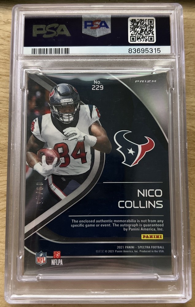 The 2021 Panini Spectra Rookie Patch Autographs Nico Collins #229 Neon Pink Prizm /25 is a highly sought-after sports trading card featuring the rookie player Nico Collins from the Houston Texans. This limited edition card is part of the Panini Spectra set and is graded a perfect 10 by Professional Sports Authenticator (PSA). With only 25 copies in existence, this card is a valuable addition to any football card collection, especially for fans of the National Football League (NFL) looking for unique and rare memorabilia.