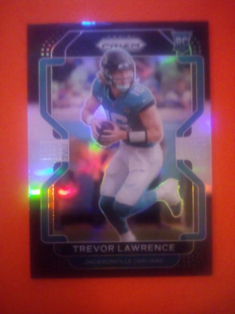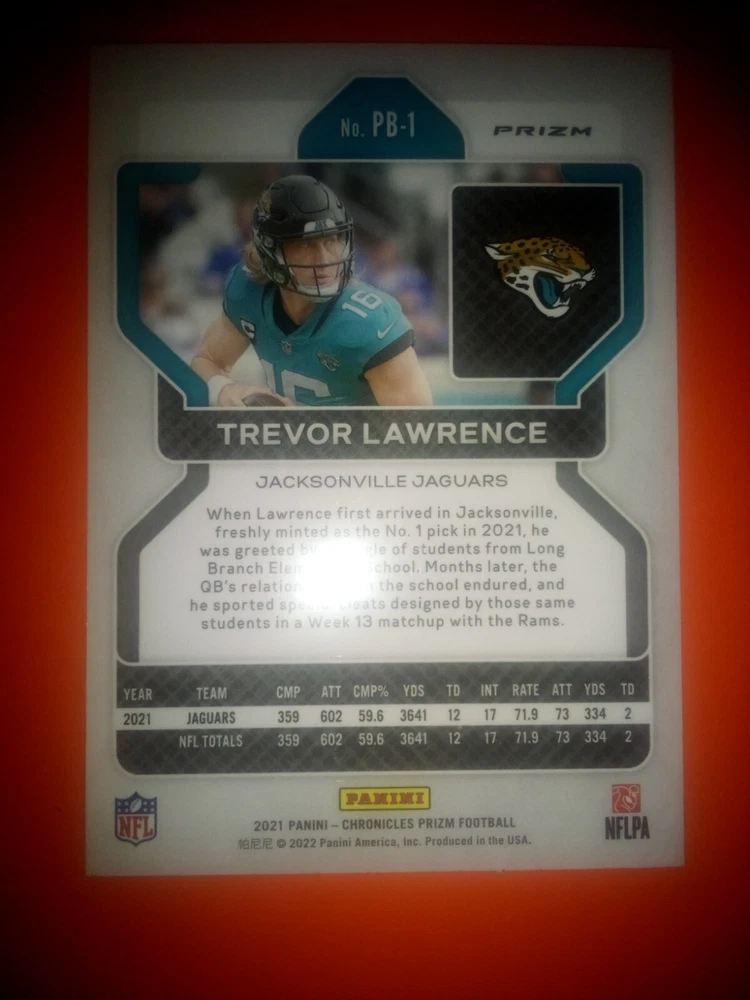 This is a 2021 Panini Prizm Football Rookie card featuring Trevor Lawrence of the Jacksonville Jaguars. The card has a Black and Silver Holo design and is part of the 2021 Panini Prizm set. It is a Sports Trading Card with a Card Number of No. PB-1 and is manufactured by Panini. The card features the National Football League (NFL) player and athlete and is a great addition to any football fan's collection.