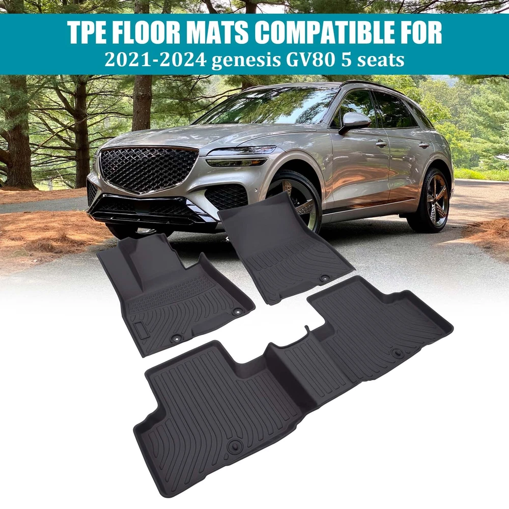 Specification Type: Floor Mat Set Material: TPE Rubber Number of Pieces: 3pcs color: Black Package Dimensions: (inch): 29.53"L x 22.05"W x 7.87"Th Condition: New Warranty: 90 days warranty for quality problems Package Weight: (lbs): 12.13 Fitment 2021-2023 Genesis GV80 Features & Benefits Product Description: Introducing our Floor Mats, a perfect replacement for 2021-2023 Genesis GV80 5 Seats car floor mats. This set includes 2 front floor mats and 1 rear floor liner, all designed and crafted using 3D laser scanning technology. This cutting-edge technology ensures full coverage and protection for both front and rear areas of your vehicle. Our floor mats are made from non-toxic, odorless TPE material, free from harmful substances such as latex, cadmium, lead, and PVC. They are environmentally friendly and designed to withstand all weather conditions including rain, fog, and snow. These floor mats have a unique design that effectively keeps mud, snow, water, and debris off your vehicle's expensive and hard-to-clean carpet. They are a must-have accessory to protect your vehicle from all kinds of messes. Cleaning these mats is a breeze - simply shake off the dirt and mud or use a common hose. They require no special maintenance and their durability can be maintained for a long time. Invest in our Floor Mats and ensure the longevity and cleanliness of your Genesis GV80. Note: Only sold in the USA (Excluding Hawaii, Alaska, Puerto Rico, Guam, Virgin Islands, American Samoa, Northern Mariana Islands, Palau, Federated States of Micronesia, Marshall Islands, AA, AE, AP). Warranty: If there's any problem, please feel free to contact us with your car's VIN # and the pictures or videos to show the problem within 30 days, we’ll try our best to solve it and make you satisfied. After using, the item’s warranty is 1 year, only for replacement and no refund. Hope you know.