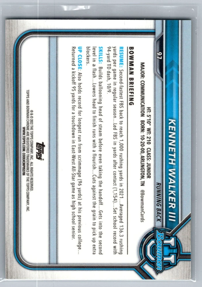 This is a nice example of a 2021-22 Bowman University #97 Kenneth Walker III Chrome Green Other important information about this card: SN In 2021 Kenneth Walker III played for the Michigan State Spartans. Please check out our other listings for more great cards.