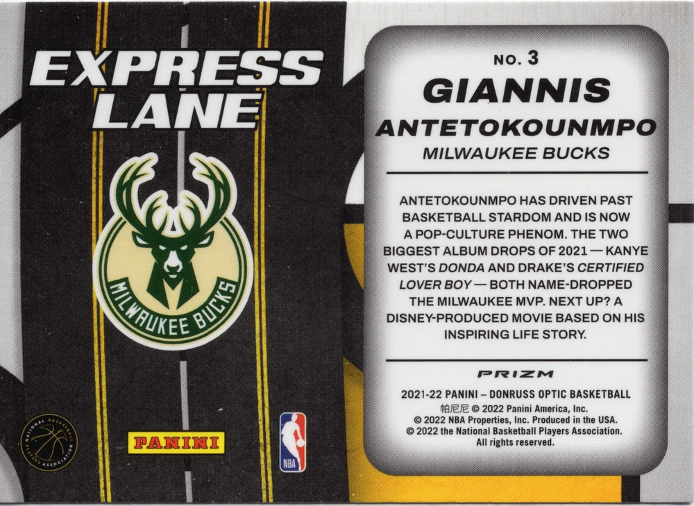 This 2021-22 Donruss Optic Express Lane Holo #3 trading card features Giannis Antetokounmpo of the Milwaukee Bucks. The card is made of high-quality card stock with a thickness of 35 Pt. and is an original licensed reprint. It belongs to the National Basketball Association (NBA) league and is related to the NBA Finals event/tournament. The card is a standard size and is not autographed. It is a sports trading card of the Optic parallel/variety, manufactured by Donruss in the United States. The card number is #3 and it is related to the 2021-22 season. The language is English and the sport is basketball.