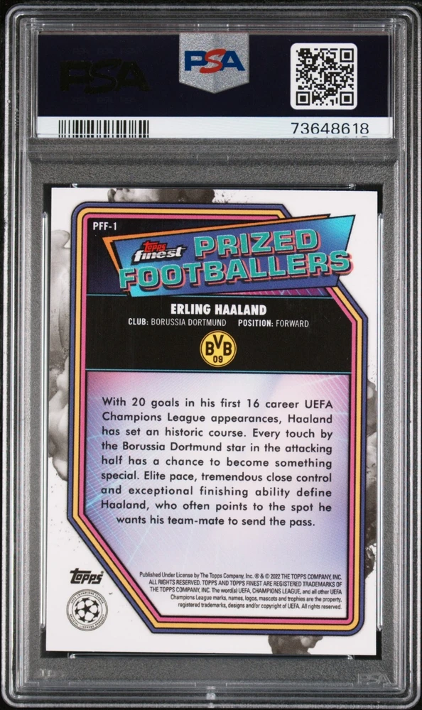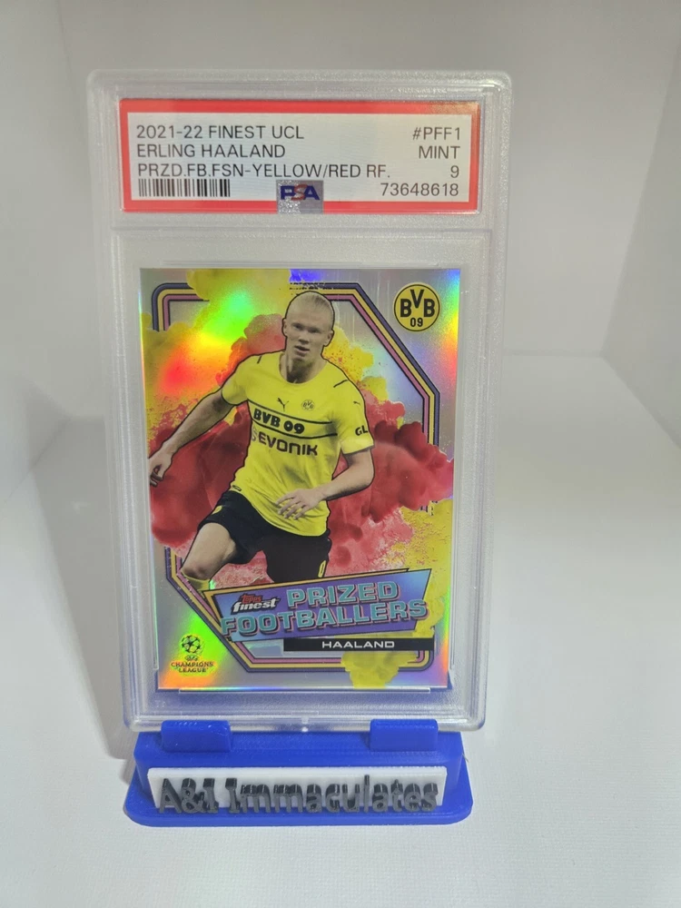 Showcase your love for soccer with this 2021-22 Topps Finest UCL trading card featuring the talented Erling Haaland in the iconic Borussia Dortmund yellow. This card is graded 9 by PSA. It is a part of the Prized Footballers Fusion series and is ideal for any collector who is a fan of soccer. Do not miss the opportunity to obtain this card from one the greateat goal scorers to have played the beautiful game of soccer. Erling Haaland is sure to continue making history.