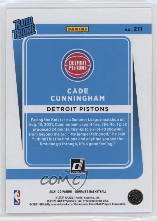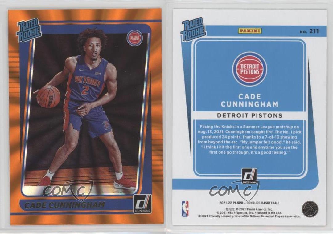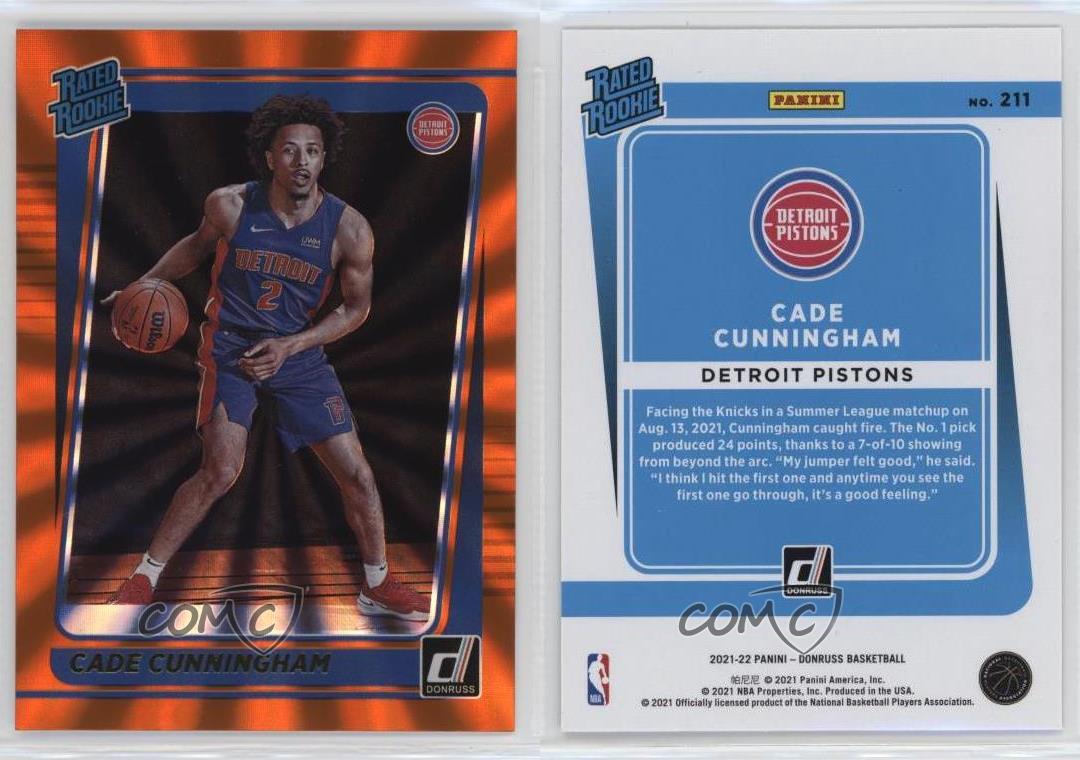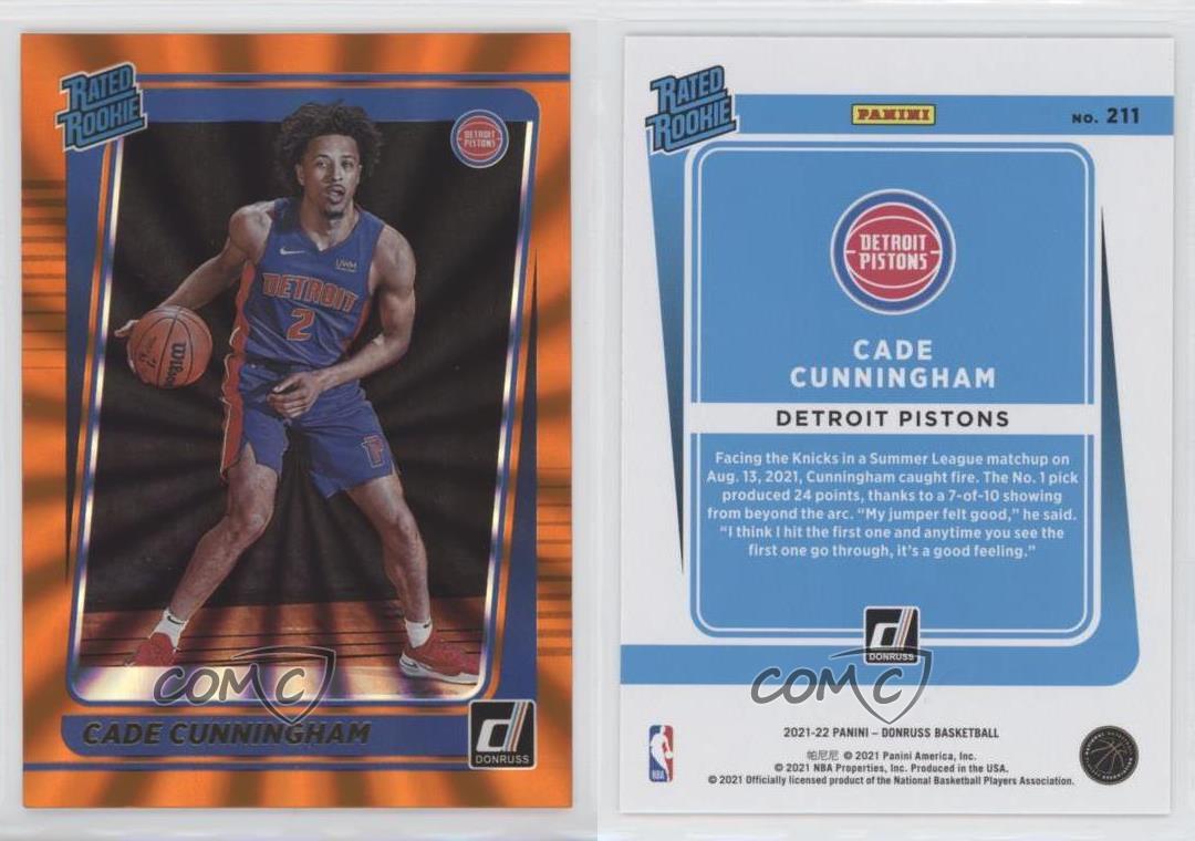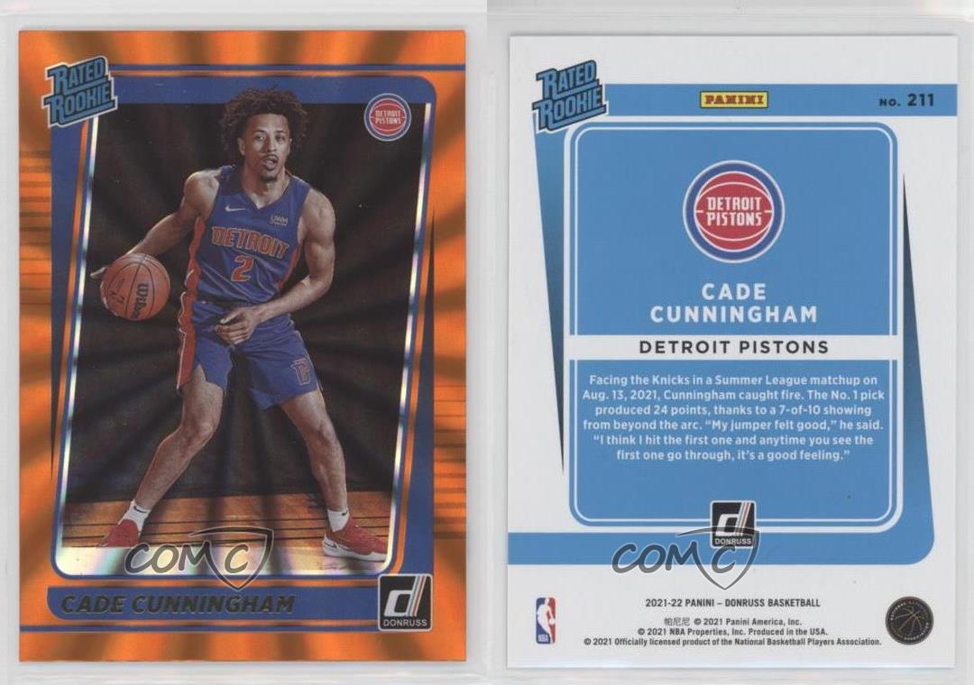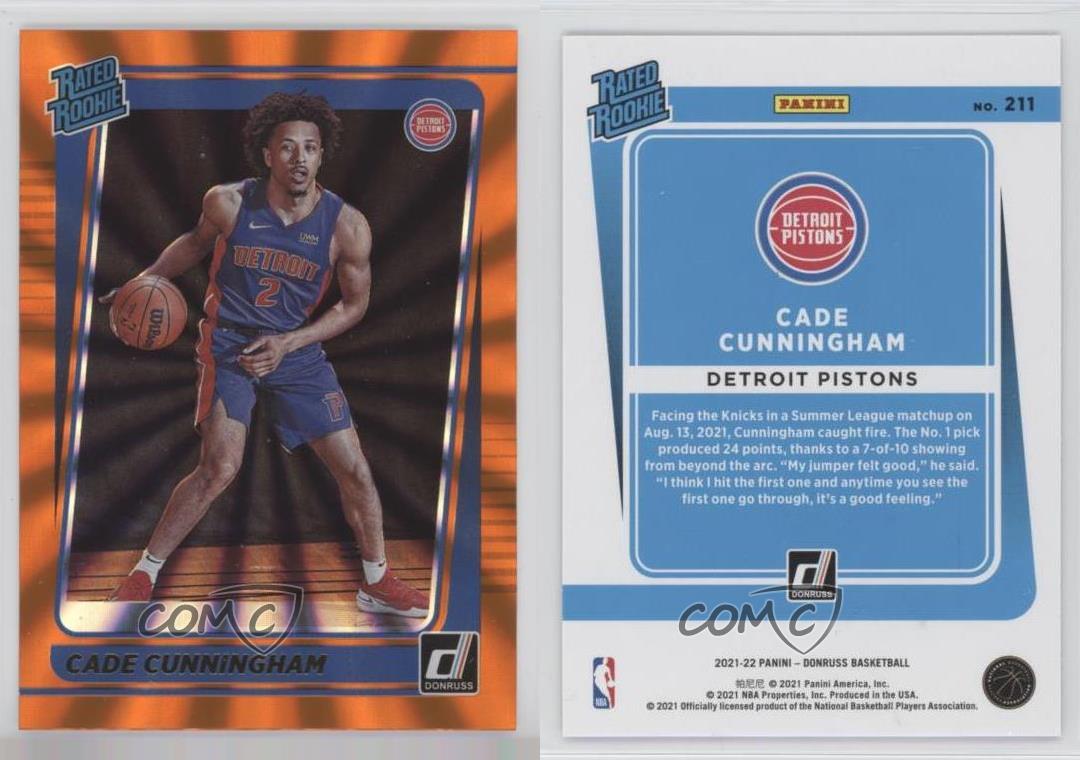 2021-22 Panini Donruss - [Base] - Holo Orange Laser #211 Rated Rookie - Cade Cunningham - RC (Rookie Card) - Basketball Card - Featuring the Detroit Pistons - Featuring Cade Cunningham Search for more: 2021-22 Panini Donruss Search for more: 2021-22 Panini Donruss - [Base] - Holo Orange Laser View all of our Listings Auctions Buy It Now About Us Located in the beautiful Pacific Northwest, COMC (Check Out My Cards) is the world's largest consignment service for trading card singles. More than 10,000 people have used our consignment service to list over 50 million trading cards. Find out how we can help you consign your items on eBay by contacting us through eBay messaging. COMC -- "The Safe & Easy Way to Buy & Sell" Representative Image - Select Specific Item above to see image of actual item Representative Image - Select Specific Item above to see image of actual item Raw Condition for Modern Cards Unless otherwise noted, raw modern cards are listed in Near Mint-Mint condition or better. A NM-MT card appears to be Mint at first glance, but upon closer inspection, may exhibit some of the following: minor print defects (e.g. roller marks, print line, dimple), minor scratches, slight edge wear, and slight corner wear. Centering is clearly visible in the images provided and does not factor into our condition assessment. Raw Condition for Vintage Cards Unless otherwise noted, raw vintage cards are listed in Excellent condition or better. An EX card may exhibit some of the following: minor rounding of corners, surface wear, print defects, light scratches, and slight edge wear/chipping. Centering is clearly visible in the images provided and does not factor into our condition assessment. Domestic Shipping Combined shipping for multiple items is available. To receive combined shipping, please ensure all desired items are in your eBay shopping cart before proceeding to checkout. eBay limits orders to 40 items per order. We automatically combine multiple orders placed on the same day. If you place multiple orders on the same day, please contact us to request a refund of applicable shipping costs. Signature confirmation may be required on invoices over $400. All cards are protected and shipped securely. International Shipping COMC offers eBay's International Shipping (EIS) for international orders under $2,500* (see country exceptions below). All duties and import fees are paid at checkout; in the rare event that there are additional import fees upon delivery, these are borne by the buyer. EIS packages route through a shipping hub in Erlanger, KY before shipping to their final destination. Please note that EIS does not allow for combined shipments. The shipping rates are determined by eBay and cannot be adjusted. *Maximum sale price exceptions: Colombia, Kuwait ($2,000); Taiwan ($1,539); Chile, Costa Rica, Guatemala, Honduras, Trinidad and Tobago ($1,000); Antigua and Barbuda, Aruba, Belize, Dominica, Grenada, Philippines, Saint Kitts and Nevis, Saint Lucia, Montserrat, Turks and Caicos Islands ($500); Dominican Republic, El Salvador ($200). Please request a shipping quote through eBay messaging for orders that exceed the maximum sale price supported by eBay's International Shipping. You will be responsible for all duties and import fees for international orders shipped outside the EIS. All cards are protected and shipped securely. Payment COMC does not accept offers on our cards through our eBay storefront. COMC utilizes eBay’s managed payments system. If you are experiencing difficulties making a payment, please contact eBay for assistance. Return Policy Returns are only accepted on the rare occasion the item is not as described. If you are making a return, please initiate the return process through eBay so a mailing label can be provided for you. Prior to listing, our expert team carefully assessed this item to represent it accurately. Please review the description and high-definition images prior to purchasing to ensure this item meets your satisfaction. We welcome you to contact us if you have further questions about this item. Trust and Integrity COMC carefully assesses each item consigned to us to prevent fraudulent items from entering the marketplace. If you believe an item offered on COMC may be fraudulent, please contact us with details so we can investigate the issue. Items we determine are outside our supported items policy may be removed. Last Modified: 2/11/2025 4:20:25 PM PDT