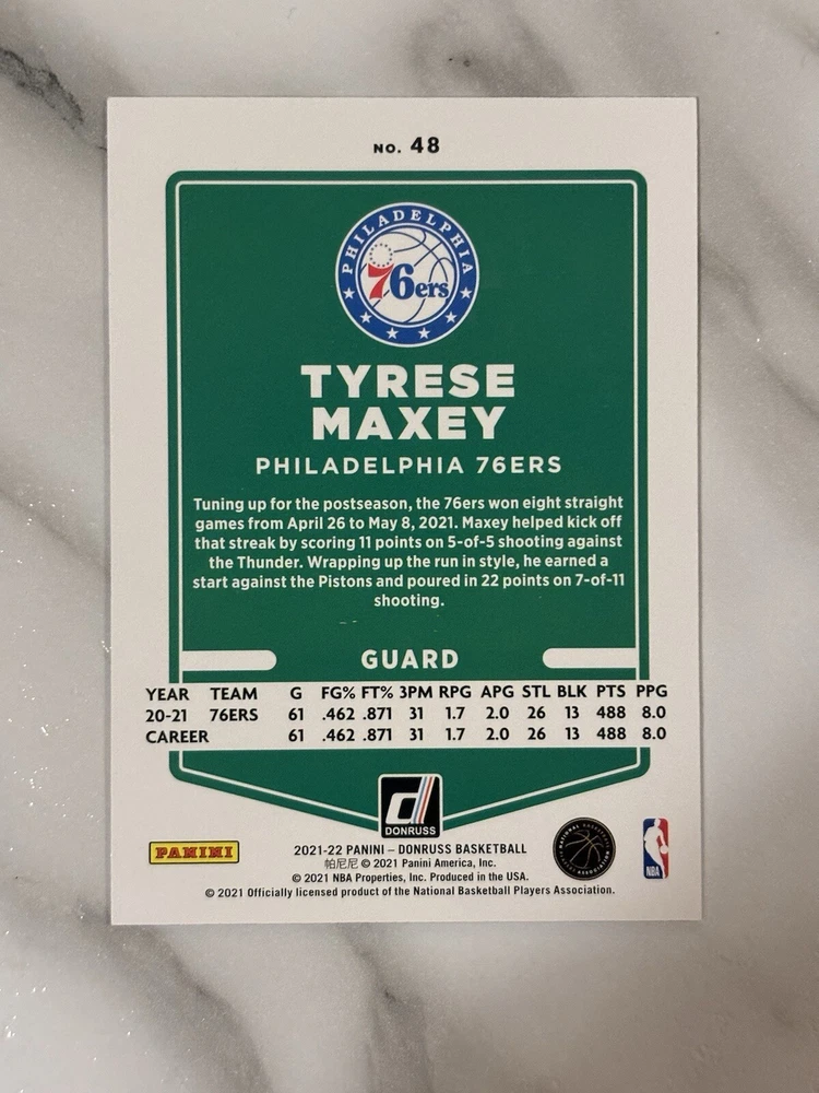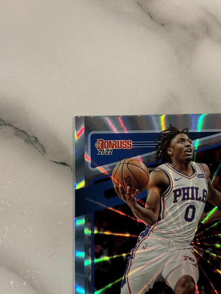 League: National Basketball Association (NBA) Features: Parallel/Variety, Serial Numbered, Short Print Player/Athlete: Tyrese Maxey Sport: Basketball Season: 2021-22 Team: Philadelphia 76ers Parallel/Variety: Holo Manufacturer: Donruss Set: 2021-22 Panini Donruss Type: Sports Trading Card