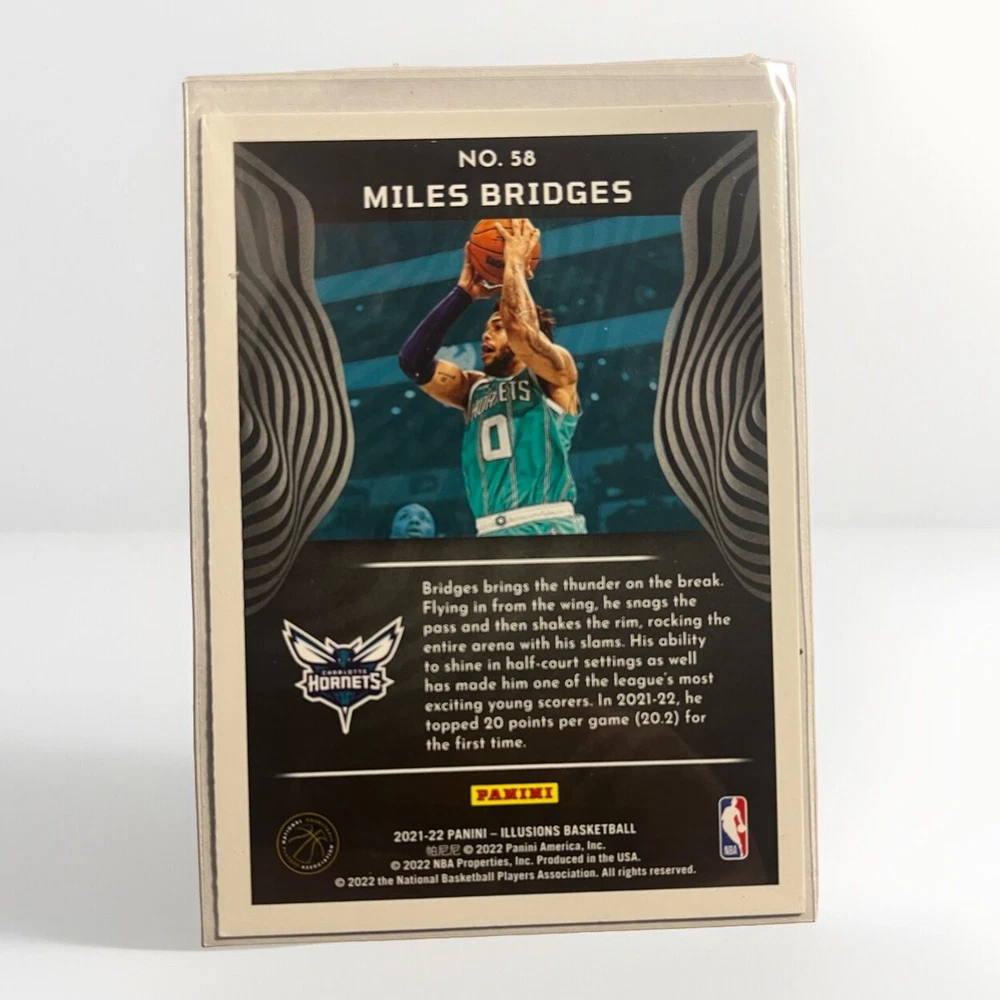 The 2021-22 Panini Illusions Teal #58 Miles Bridges trading card features the Charlotte Hornets forward in the National Basketball Association (NBA). This original sports trading card is part of the base set for the 2021-22 season and showcases Bridges in near mint or better condition on card stock material. The teal parallel variety adds a unique touch to this ungraded collectible, making it a desirable addition for fans and collectors of basketball trading cards.