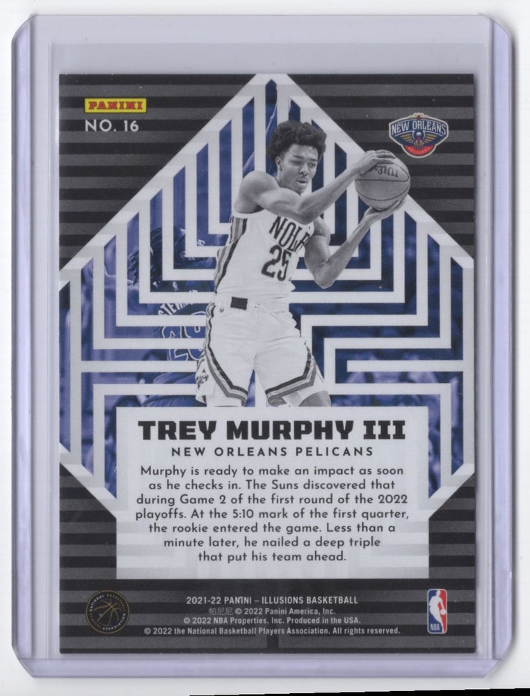 About Me Other Listings Feedback Add to Favorites Contact Me Striking Cards 901 2021-22 Panini Illusions Instant Impact Trey Murphy III New Orleans Pelicans #16 No stock photo / These are real scans or pictures Details Description: Trey Murphy III Category: Basketball Year: 2021 Product: Panini Illusions Instant Impact Team: New Orleans Pelicans Card Number: 16 Dimensions: 4" x 3" SKU: BK B0001 R01 B (40) Listing By Kronocard trading cards software v2.6.5.5