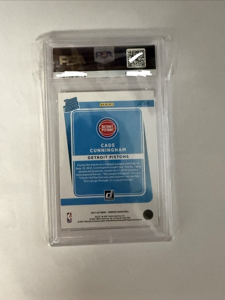 The photo is a 2021-22 Panini Prizm Cade Cunningham Rookie 211 Orange Laser photo. This basketball card features Cade Cunningham from the Detroit Pistons, with a limited print run of only 75. It is an original photo made of paper, not autographed but signed by Cade Cunningham himself. This collectible item is perfect for fans and collectors of the National Basketball Association looking to add a rare and valuable piece to their collection.