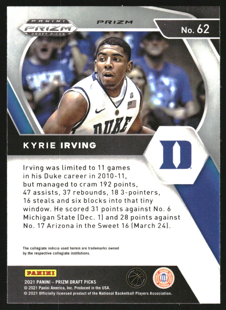 2021-22 Panini Prizm Draft Picks Prizms Red Ice #62 Kyrie Irving Front Back Sport: Basketball Set: 2021-22 Panini Prizm Draft Picks Prizms Red Ice Year: 2021 Item#: 62 Player: Kyrie Irving Brand: Panini Prizm Draft Picks Manufacturer: Panini Group Grading Company: Raw Grade SetType: Parallel Item Condition: Near Mint/Mint 2014 Beckett Collectibles, LLC. All Rights Reserved Powered by: Thank you for choosing Burbank Sportscards, the sports cards superstore. We offer a large selection of singles across all sports. Visit our ebay store to view all our items available. Our Shipping Policy We offer Free Standard Shipping to all Domestic customers. Options for Expedited shipping are also available at checkout. For our international customers, shipping is $9.99 for the first item, and $0.25 for each additional item. Note to all customers: To qualify for combines shipping, we ask our customers to add items into the shopping cart. Please note, we do not combine orders that are placed separately. Our Service: Generally, our turnaround is super quick as we process and send out orders same day payment is received. Stock Availability: We do our best to ensure all items are in stock; however, in case of the rare stock out, the customer will have the option for a replacement card, or we will process a refund so the order is not held up. Our Images: Many of our images are stock photos from Beckett archives. They are a representation of the actual card you would receive. If you have any questions regarding the item you're interested in, please feel free to ask (serial numbers and relic pieces may vary) Moreover, in a case of a wrong or defective photo, please notify us, so we can adjust it. Other FAQ's: -When buying multiple cards, do you top load each item? No; however, we do try to insure all items are shipped securely. If you wish to have all of your cards top loaded it is a paid service and can be arranged. Please email for more details. For other questions, please feel free to ask. Thank you.