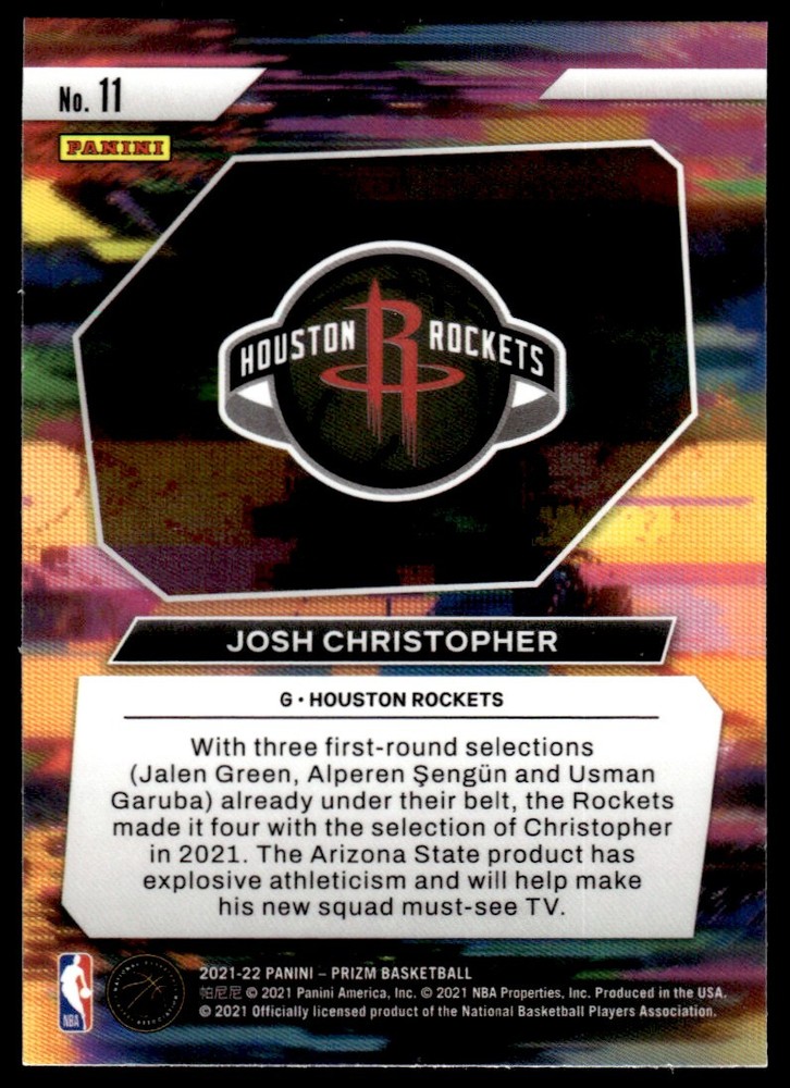 Original/Reprint: Original Team: Houston Rockets Card Manufacturer: Panini Group Product: Single Year: 2021 Player: Josh Christopher Item Condition: Near Mint/Mint Sport: Basketball Brand: Panini Prizm Period: Modern (1970-Now) Graded: No Grade: Near Mint/Mint