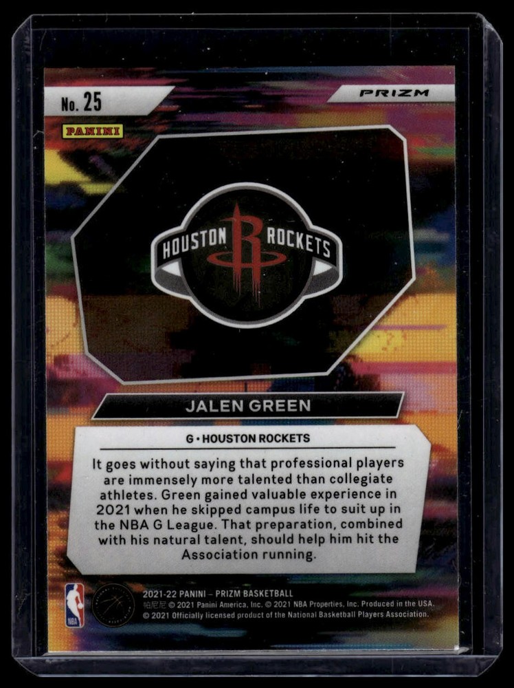 Card Number: 25 Team: Houston Rockets Set: 2021-22 Panini Prizm Autographed: No Sport: BASKETBALL Season: 2021 Type: Sports Trading Card Player/Athlete: Jalen Green Year Manufactured: 2021 Parallel/Variety: Instant Impact Prizms GreenRC Insert Set: Instant Impact Prizms GreenRC Graded: No Manufacturer: Panini League: NBA