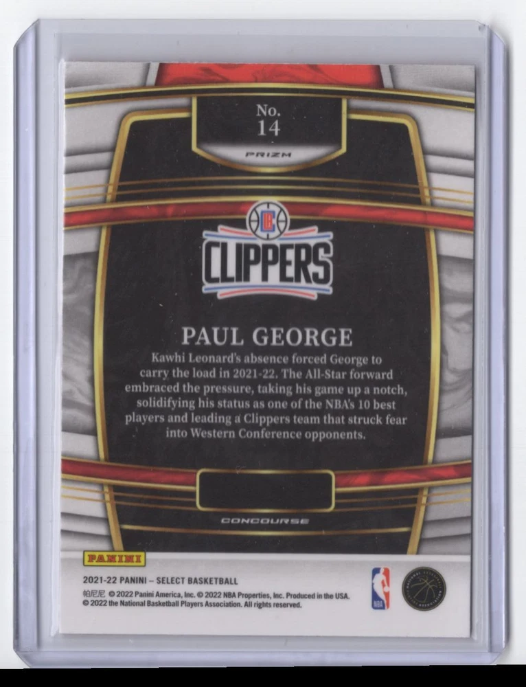 Franchise: Basketball Type: Sports Trading Card Original/Licensed Reprint: Original Card Name: 2021-22 Panini Select Orange Flash Prizm Paul George Los Angeles Year Manufactured: 2021 Game: Unspecified Autographed: No Graded: No Player/Athlete: Paul George Sport: Basketball Team: Los Angeles Clippers Set: Panini Select Orange Flash Prizm Card Number: 14 Card Size: 4" x 3" Vintage: No Season: 2021 Character: Paul George