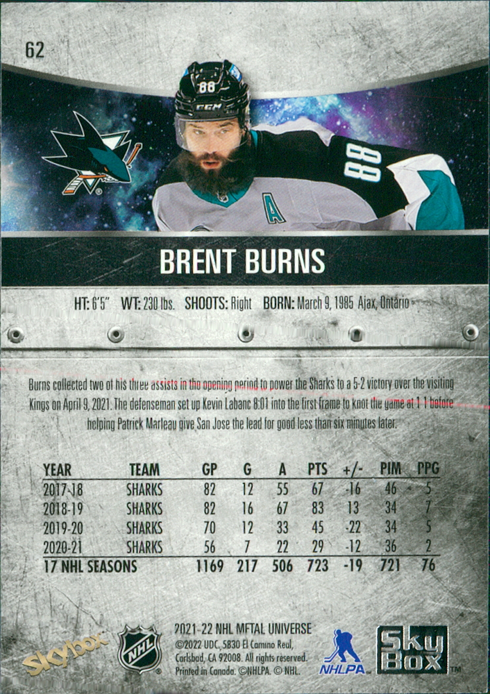 Home2021-22 Skybox Metal Universe Brent Burns #62 Hockey Card