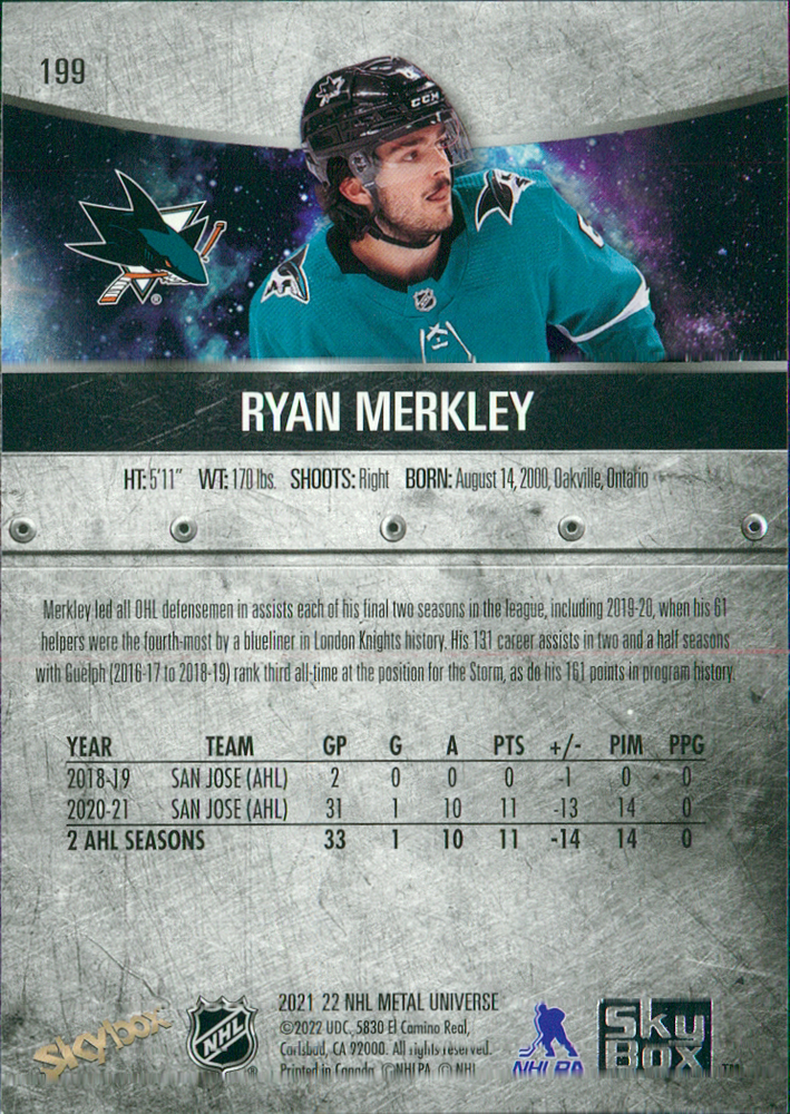 Home2021-22 Skybox Metal Universe Rookie Card #199 Ryan Merkley RC