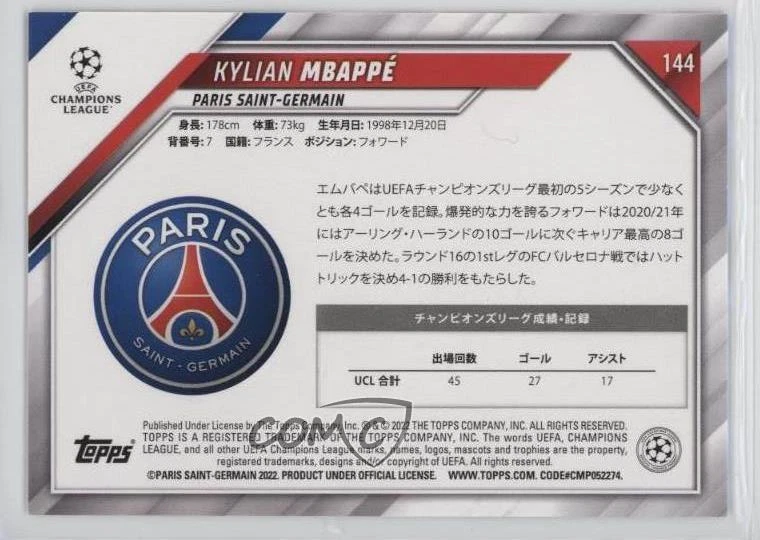 2021-22 Topps UCL Collection Japanese Edition - [Base] #144 Kylian Mbappé - Soccer Card - Featuring the Paris Saint-Germain - Featuring Kylian Mbappe Search for more: 2021-22 Topps UCL Collection Japanese Edition Search for more: 2021-22 Topps UCL Collection Japanese Edition - [Base] View all of our Listings Auctions Buy It Now About Us Located in the beautiful Pacific Northwest, COMC (Check Out My Cards) is the world's largest consignment service for trading card singles. More than 10,000 people have used our consignment service to list over 50 million trading cards. We currently house 20 million cards, each listed for sale with front and back images of the actual card. Find out how we can help you consign your items on eBay by contacting us through eBay messaging. COMC -- "The Safe & Easy Way to Buy & Sell" Representative Image - Select Specific Item above to see image of actual item Representative Image - Select Specific Item above to see image of actual item Raw Condition for Modern Cards Unless otherwise noted, raw modern cards are listed in Near Mint-Mint condition or better. A NM-MT card appears to be Mint at first glance, but upon closer inspection, may exhibit some of the following: minor print defects (e.g. roller marks, print line, dimple), minor scratches, slight edge wear, and slight corner wear. Centering is clearly visible in the images provided and does not factor into our condition assessment. Raw Condition for Vintage Cards Unless otherwise noted, raw vintage cards are listed in Excellent condition or better. An EX card may exhibit some of the following: minor rounding of corners, surface wear, print defects, light scratches, and slight edge wear/chipping. Centering is clearly visible in the images provided and does not factor into our condition assessment. Domestic Shipping Combined shipping for multiple items is available. To receive combined shipping, please ensure all desired items are in your eBay shopping cart before proceeding to checkout. eBay limits orders to 40 items per order. We automatically combine multiple orders placed on the same day. If you place multiple orders on the same day, please contact us to request a refund of applicable shipping costs. Signature confirmation may be required on invoices over $400. Raw cards are shipped in toploaders. International Shipping COMC offers eBay's International Shipping (EIS) for international orders under $2,500* (see country exceptions below). All duties and import fees are paid at checkout; in the rare event that there are additional import fees upon delivery, these are borne by the buyer. EIS packages route through a shipping hub in Erlanger, KY before shipping to their final destination. Please note that EIS does not allow for combined shipments. The shipping rates are determined by eBay and cannot be adjusted. *Maximum sale price exceptions: Colombia, Kuwait ($2,000); Taiwan ($1,539); Chile, Costa Rica, Guatemala, Honduras, Trinidad and Tobago ($1,000); Antigua and Barbuda, Aruba, Belize, Dominica, Grenada, Philippines, Saint Kitts and Nevis, Saint Lucia, Montserrat, Turks and Caicos Islands ($500); Dominican Republic, El Salvador ($200). Please request a shipping quote through eBay messaging for orders that exceed the maximum sale price supported by eBay's International Shipping. You will be responsible for all duties and import fees for international orders shipped outside the EIS. Raw cards are shipped in toploaders. Payment COMC does not accept offers on our cards through our eBay storefront. COMC utilizes eBay’s managed payments system. If you are experiencing difficulties making a payment, please contact eBay for assistance. Return Policy Returns are only accepted on the rare occasion the item is not as described. If you are making a return, please initiate the return process through eBay so a mailing label can be provided for you. Prior to listing, our expert team carefully assessed this item to represent it accurately. Please review the description and high-definition images prior to purchasing to ensure this item meets your satisfaction. We welcome you to contact us if you have further questions about this item. Trust and Integrity COMC carefully assesses each item consigned to us to prevent fraudulent items from entering the marketplace. If you believe an item offered on COMC may be fraudulent, please contact us with details so we can investigate the issue. Items we determine are outside our supported items policy may be removed. Last Modified: 12/11/2024 4:29:39 PM PDT