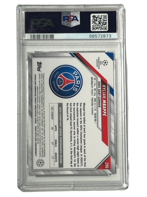 Capture a piece of soccer history with the 2021-22 Topps UCL Kylian Mbappe Starball Foil #200. This trading card features the dynamic talent of Kylian Mbappé, star player for Paris Saint-Germain, and a jewel for collectors and fans of the sport. The Starball Foil variety adds an exclusive touch to this collectible, showcasing a brilliant finish that celebrates Mbappé's presence in the UEFA Champions League. Proudly manufactured by Topps, known for their quality and commitment to sports memorabilia, this card is a standout from the 2021 Topps set. With the card number 200, it's a must-have for those looking to complete their collection or to honor their admiration for one of soccer's rising stars.