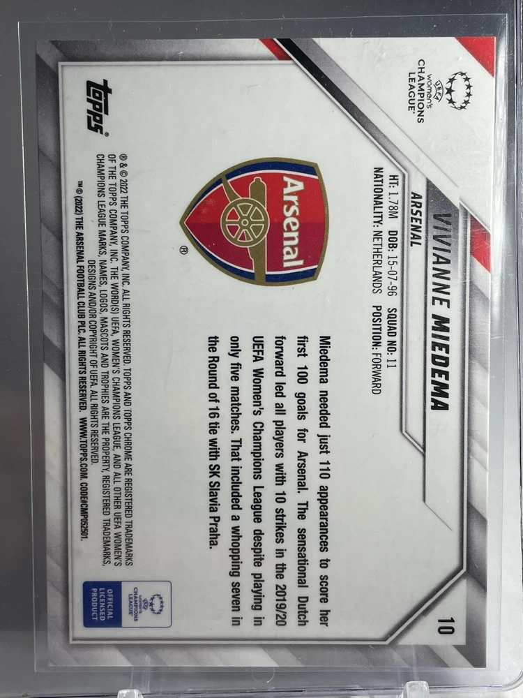 This trading card features Vivianne Miedema, a rising star in women's soccer. She currently plays for Arsenal in the 2021-22 Topps Chrome Women's Champions League. This card is a must-have for any collector who is a fan of the sport and the league. The card is a rookie card, making it even more special for collectors. It features Miedema in action, wearing her Arsenal jersey. The card is manufactured by Topps and is part of the 2021-22 Topps Chrome Women's Champions League set. It is perfect for fans of Juventus, FC Barcelona, Real Madrid, Chelsea and Paris Saint-Germain, as they will also appreciate this amazing card. Get it now and add it to your collection!