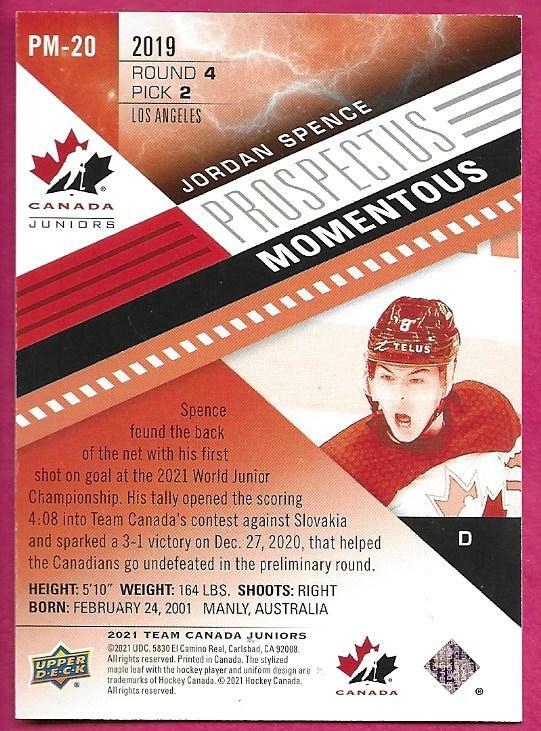 You are bidding on a wonderful Upper Deck Team Canada Juniors 2021-2022 UD TEAM CANADA JUNIORS JORDAN SPENCE #PM-20 PROSPECTUS MOMENTOUS 088/275 ELECTRIC RED PARALLEL WOW! SHIPPING AND HANDLING : Canada $3.50 + $0.25 for every additional card USA $5.00 + $0.25 for every additional card Worldwide $7.00 + $0.25 for every additional card Payment is expected within 7 days If you win multiple items, please wait for the invoice with combined shipping If you have any questions, please send a message I HAVE 100 % POSITIVE FEEDBACK SO BID WITH CONFIDENCE
