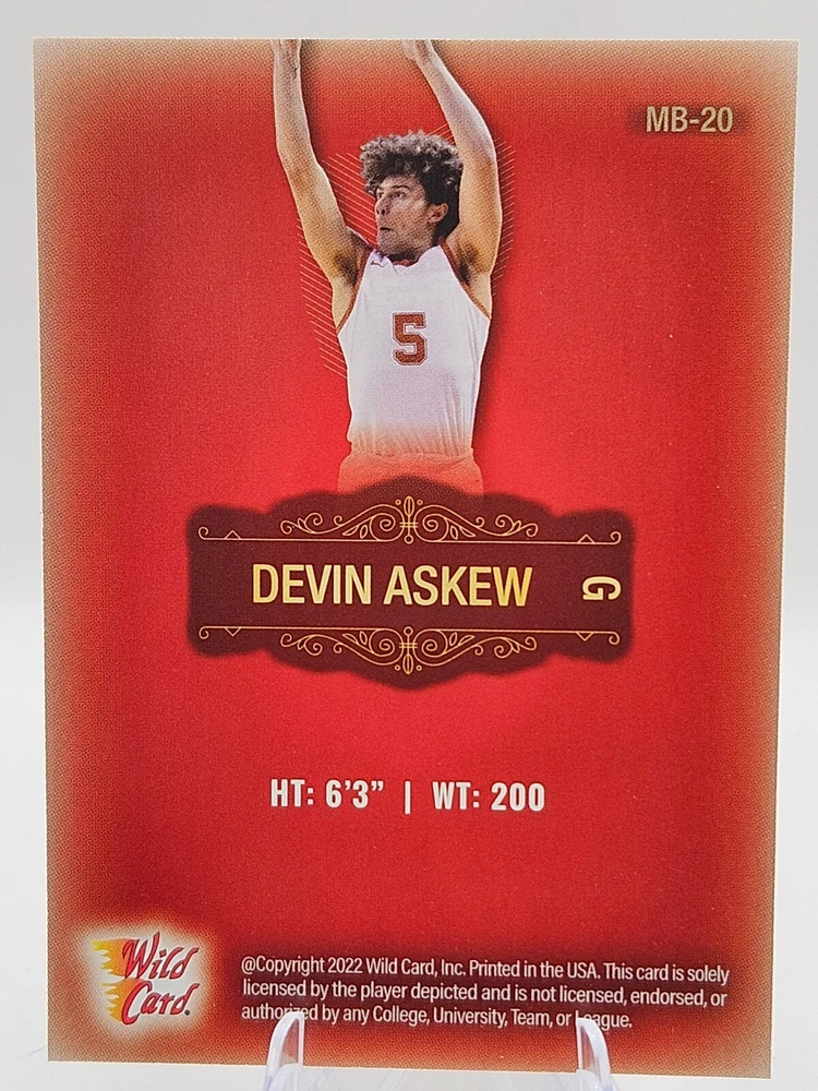 Elevate your basketball card collection with the 2021-22 Wild Card Red Matte Chase Devin Askew MB-20. This striking card features the promising talent of Devin Askew, capturing the essence of his rookie season. The red matte finish adds a unique touch of sophistication, distinguishing it from standard cards. As a sought-after piece from the 2021 Wild Card MATTE set, this card is a must-have for enthusiasts and collectors alike. Its chase feature marks it as a rare find, complemented by the originality guaranteed by Wild Card, Inc. For fans of the sport or collectors pursuing the Devin Askew card, this parallel variety is a notable addition.