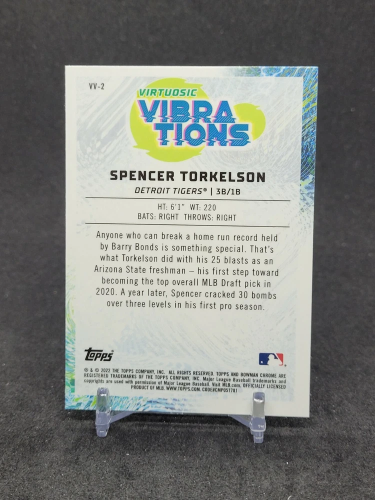 2022 Bowman Baseball Chrome Spencer Torkelson #VV-2 Virtuosic Vibrations Insert. Discounts are available for the purchase of 3 or more trading cards. Shipping is only $.25 for each additional card. Please look at the large selection of trading cards in our store for a great chance to save and add to your collection! Discounts are available for the purchase of 3 or more trading cards. Shipping is only $.25 for each additional card. Please look at the large selection of trading cards in our store for a great chance to save and add to your collection!