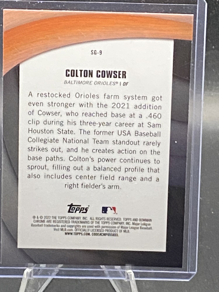 This is a nice example of a 2022 Bowman Chrome #SG-9 Colton Cowser Shades of Greatness Other important information about this card: In 2022 Colton Cowser played for the Baltimore Orioles. Please check out our other listings for more great cards.