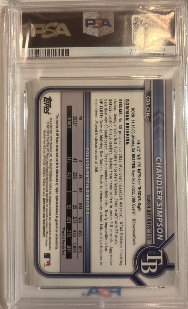 The product is a 2022 Bowman Chrome Draft Black Refractor autographed trading card featuring Chandler Simpson of the Tampa Bay Rays. This limited edition card is part of the Chrome Draft Pick Autographs insert set, signed by Simpson in a hard-signed format. With a print run of 75 this graded card has received a high grade of 9 from Professional Sports Authenticator (PSA), making it a valuable addition to any baseball card collection. As a rookie card from Topps, this gold wave refractor parallel is a sought-after item for fans and collectors alike.