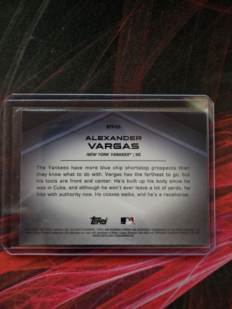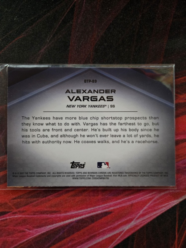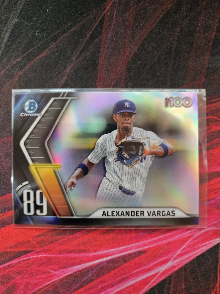 The 2022 Bowman - Chrome Bowman Scouts Top 100 #BTP-89 Alexander Vargas (RC) trading card features rookie player Alexander Vargas from the New York Yankees. This sports trading card is part of the 2022 Bowman set and showcases Vargas as part of the Top 100 prospects in the MLB. Manufactured by Topps, this card is made of card stock and is an original insert in the Bowman Scouts Top 100 series for the 2022 season.