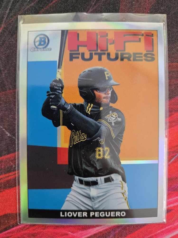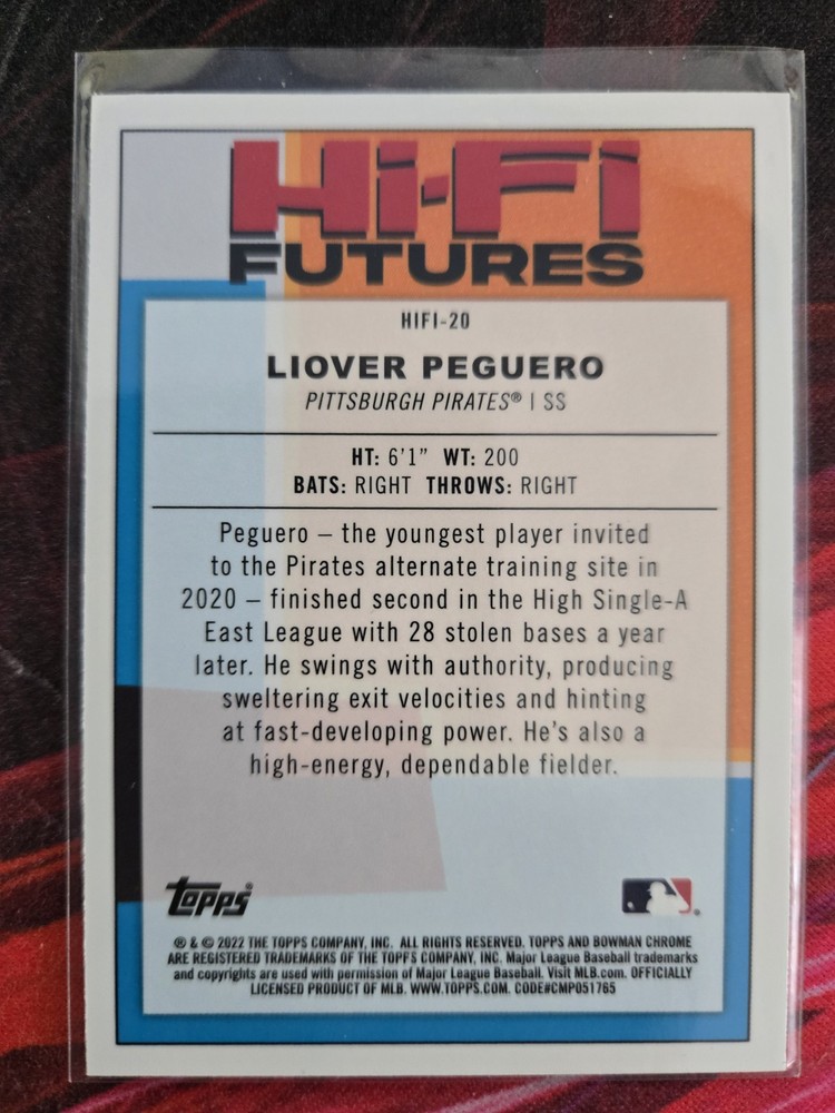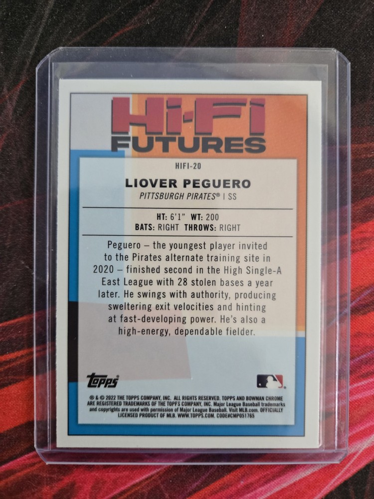 The 2022 Bowman - Hi-Fi Futures #HIFI-20 Liover Peguero trading card features the rookie player from the Pittsburgh Pirates in Major League Baseball. This original sports trading card is part of the Hi-Fi Futures insert set by Topps, manufactured in the United States on card stock with a Chrome parallel variety. The card showcases Liover Peguero and is a part of the 2022 season collection, perfect for collectors of baseball trading cards and fans of the Pittsburgh Pirates.