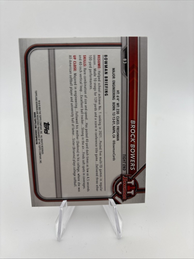 Elevate your collection with the 2022 Bowman University Brock Bowers Paper 1st Bowman #83 card, a must-have for any fan of the Georgia Bulldogs or NCAA football. This rookie card captures the essence of the promising player's early career and comes from the respected Bowman manufacturer, ensuring its place among your cherished sports memorabilia. Crafted in the United States and presented in standard card size, this piece is a true representation of collegiate athletic prowess. The base set card is an original print, not autographed, and it's a tangible slice of sports history from the 2022 season, reflecting the excellence of both the player and the university.