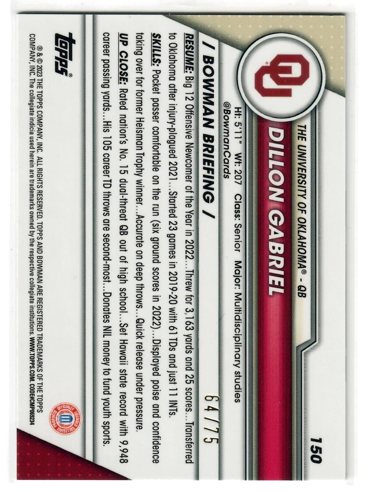 This product is a 2022 Bowman U Chrome trading card featuring football player Dillon Gabriel. It is a Fuchsia Mini Diamond Refractor parallel numbered 5 /150. Card will be shipped in a penny sleeve and top loader via USPS Ground Advantage.