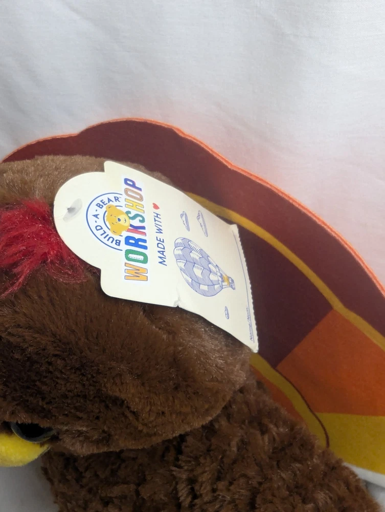 The 2022 Build-A-Bear Thanksgiving Turkey Plush Stuffed Animal is a 16-inch brown turkey stuffed animal from the Build-A-Bear Workshop Holiday Collection. With tags still attached, this original single-unit plush animal is a perfect addition to any Thanksgiving or holiday-themed collection. The turkey features brown eyes and is a retired piece manufactured in 2022, making it a unique and festive addition to any collection of bears or holiday-themed items. Good pre owned condition