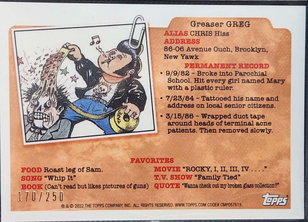Dive into the whimsical world of Garbage Pail Kids with the 2022 Topps Chrome Garbage Pail Kids Original Series 5 card, featuring the eccentric Hot Doug. As card number 185b, this Purple Refractor edition is a standout with its serial numbering, ensuring its uniqueness among collectors. With a limited run of just 250, owning this card makes for a distinguished addition to any collection. Crafted from premium card stock, this non-sport trading card captures the essence of the beloved franchise, celebrating both the comedy and fantasy elements synonymous with the series. Not autographed, this card allows the vibrant artwork of Aaron Jeffery to take center stage, bringing Hot Doug to life for fans and collectors alike. Welcome to Card Crack Chronicles – Your Source for Cards of All Eras and Types! From rookies and legends to inserts and hidden gems, our store offers a wide variety of trading cards across all sports and years. Stock is updated regularly, so be sure to follow Card Crack Chronicles and check back often! 🛒 Shipping Information 🇨🇦 Within Canada: Lettermail (Untracked): $2.99 for the first card + $0.25 for each additional card. Tracked Shipping (Expedited): $7.99 for the first card + $0.25 for each additional. 📦 Tracked shipping is required for any item priced $5.00 or more. This ensures safe delivery and peace of mind for both buyer and seller. All cards are shipped in a penny sleeve and toploader for protection. 🇺🇸 Shipping to the USA: Standard Shipping (Untracked): $4.99 for the first card + $0.25 per extra. Tracked Lettermail: $11.99 for the first card + $0.25 per extra. 📦 Tracked shipping is required for any item priced $5.00 or more. It provides tracking and delivery confirmation, especially important for cross-border shipments. Note: U.S.-bound cards are shipped in penny sleeves only (no toploaders due to customs restrictions) but are always packaged securely. 📍 Local Pickup (Hamilton, Ontario): Free local pickup available! Message before purchasing to arrange a time. 📝 Important Info You’ll always receive the exact card shown in the listing. Tracked shipping is required for all items $5 and up. Orders are shipped within 2 business days after payment is received. Payment is expected within 2 days of purchase. 💡 Tip: New cards are added regularly—follow the store and come back often to see what’s new at Card Crack Chronicles!