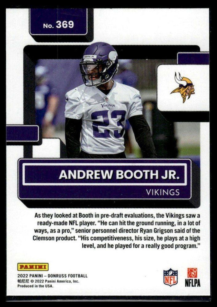 This is a nice example of a 2022 Donruss #369 Andrew Booth Jr. Other important information about this card: Rated Rookie RC,Chase,Checklist,Parallel,Insert,BASE,SP In 2022 Andrew Booth Jr. played for the Minnesota Vikings. Please check out our other listings for more great cards.