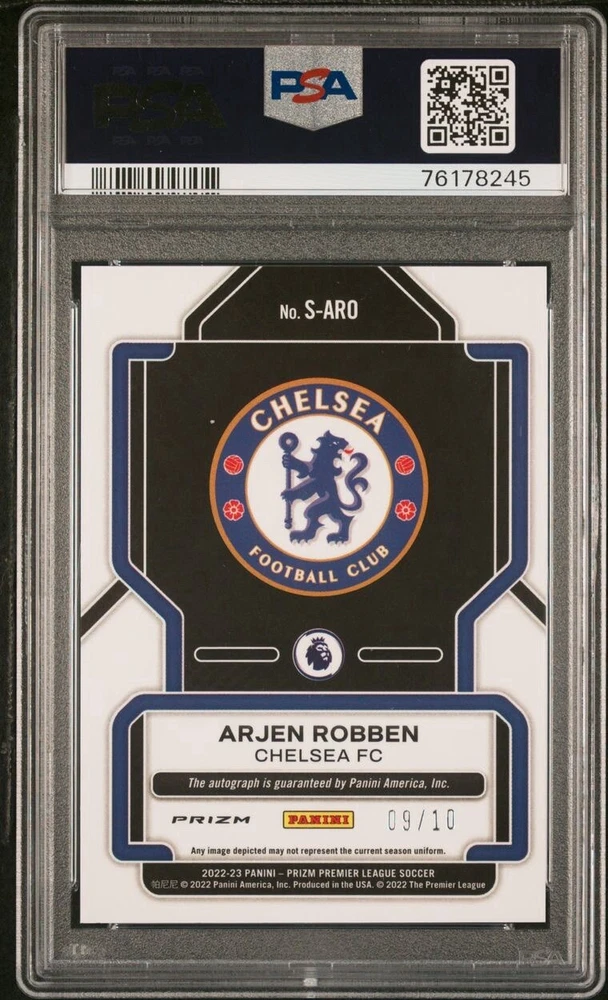 This is a 2022-23 Panini Prizm Premier League trading card featuring an autograph of soccer star Arjen Robben, signed in a label or sticker format. The card is a Gold parallel variety, numbered to /10 and graded by PSA as a 9. Authenticated by Panini Authentic, this rare collectible is from the Premier League and features Robben during his time with Chelsea. This sought-after card is a valuable addition for fans and collectors of soccer trading cards.