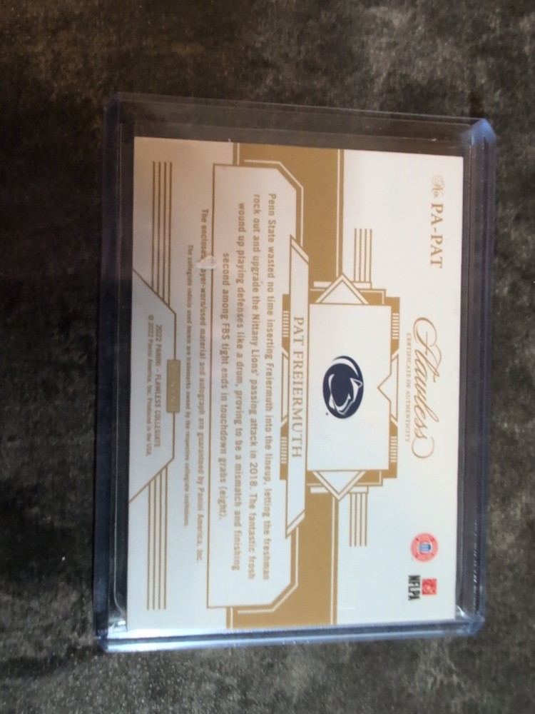 This is a 2022 Panini Flawless sports trading card featuring football player Pat Freiermuth. It is a Patch variety card with an autograph, numbered 04/25. The card is part of the Sports Trading Card type, specifically a single trading card.