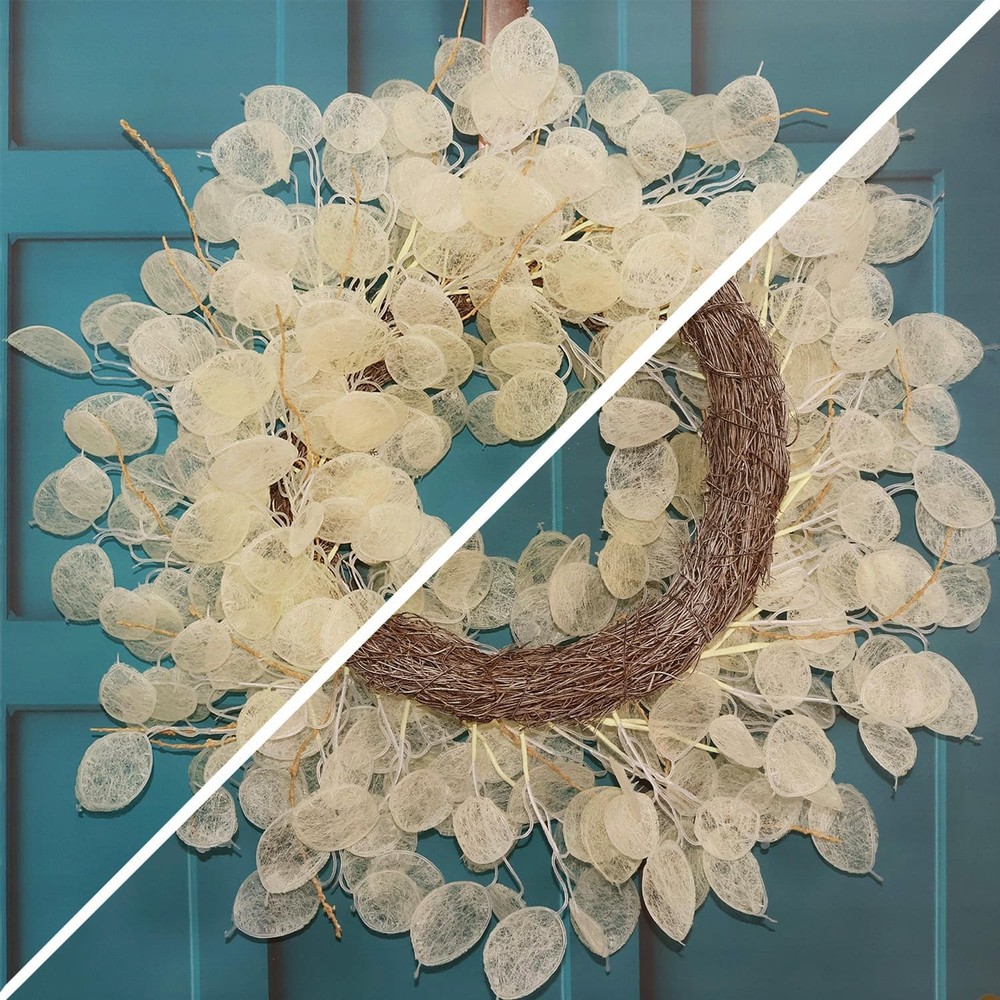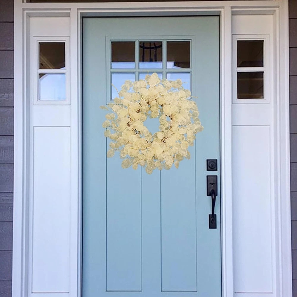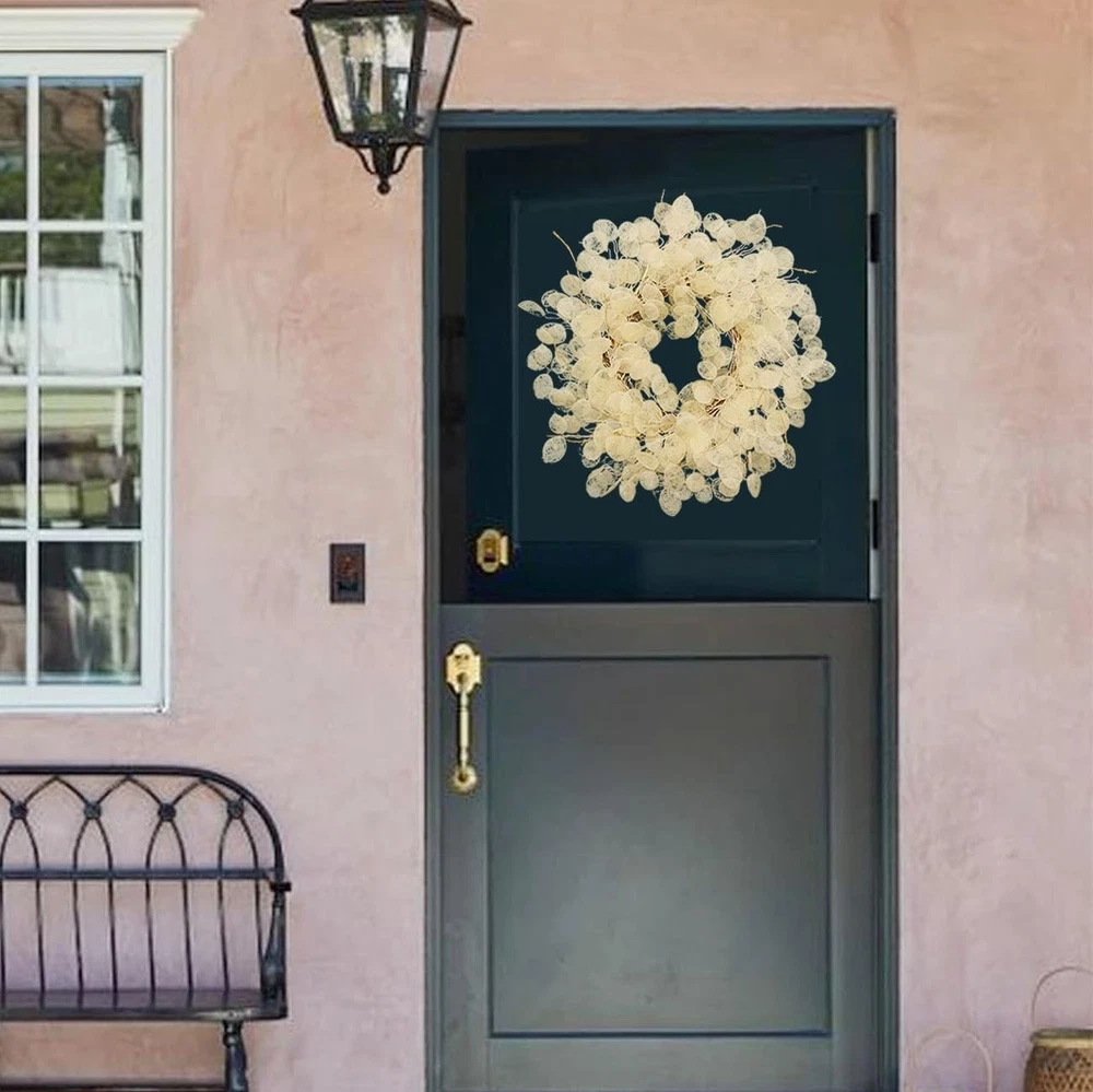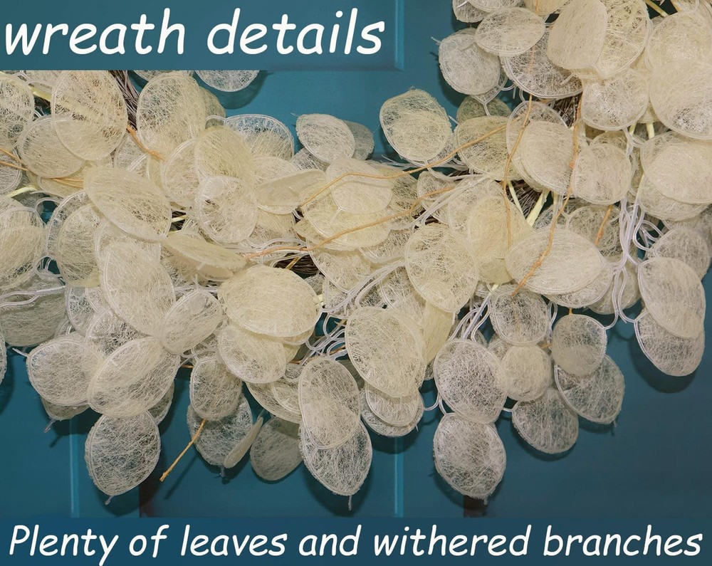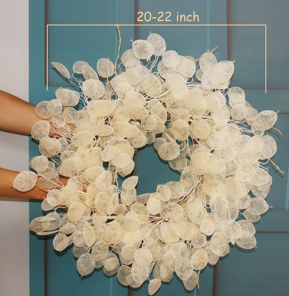 20”-22” Beige Faux Lunaria Annua Fall Wreaths For Front Door, Fake Silver Dollar Eucalyptus Leaves Winter Front Door Wreath, Boho Silver Coin Wreath Decor 🤗✅ [Gorgeous Wreath]: Crafted from lightweight, durable PP/PET artificial non-woven semi-transparent silk fabric, this cream door wreath outside features flexible eucalyptus leaves that gently sway in the breeze. Its layered, leafy design adds elegance and warmth to your front door and home. 🤗✅ [Versatile Decor]: This beige boho indoor wreath is the perfect complement to any home décor style, making this 20-22 inch artificial year-round money plant wreath a chic accent for your front door, paired doors, kitchen, fireplace, walls farmhouse or even your workplace. Ideal for all seasons—spring, summer, fall, winter, and holidays. 🤗✅ [Wreath Size and & Easy Setup]: Measuring 20-22 inches when fluffed, the pring summer boho wreath arrives in a 14-inch box for safe delivery. Simply fluff to bring out its full size. 🤗✅ [Handcrafted Quality]: 100% handcrafted with flexible, cream color translucent materials and an off-white painted natural grapevine base, front door wreath outside adds a natural touch to your home’s aesthetic. 🤗✅[Usage Tips]: The boho wreath may be compressed during shipping, so please fluff the door wreath decor before hanging. 🤗✅ [Quality Service]: The wreath may be compressed during shipping. Please fluff it upon arrival. We offer a 30-day after-sales service—if you're not satisfied or experience any quality issues!✅🤗