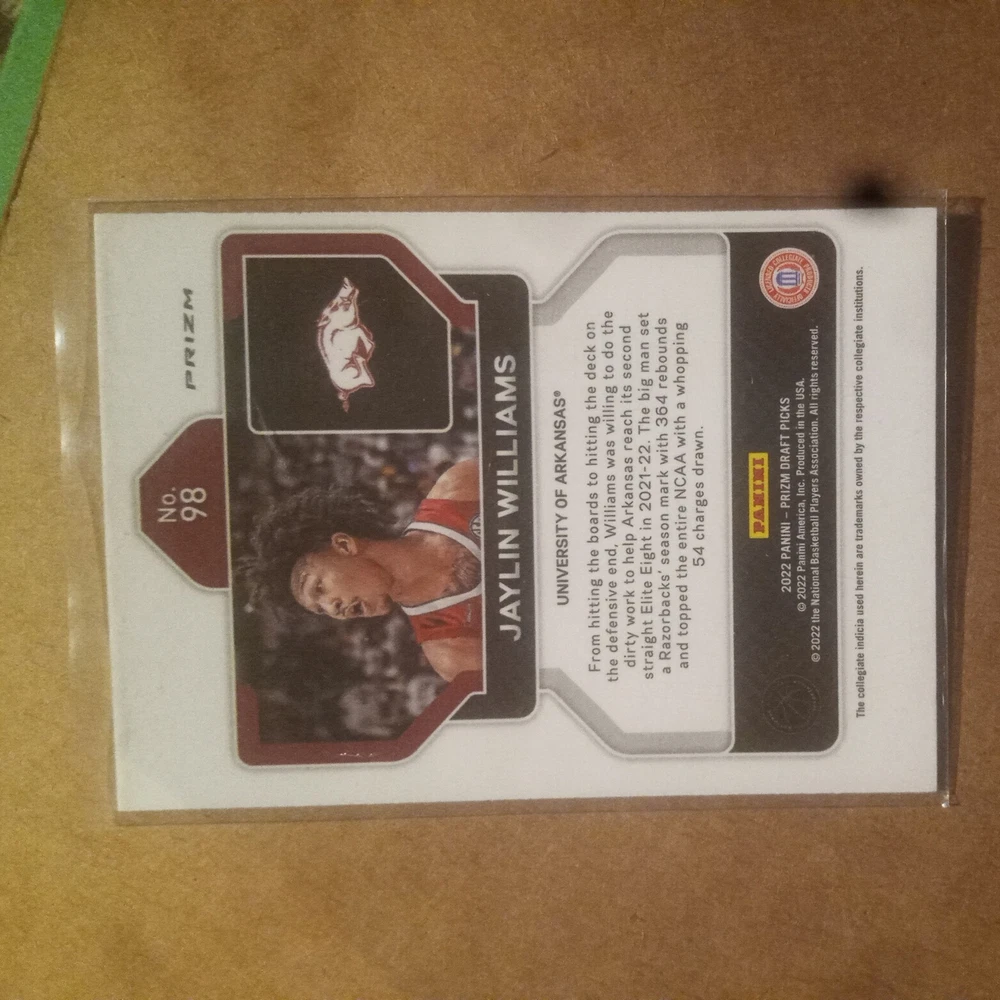 This 2022-23 Panini Prizm trading card features Jaylin Williams of the University of Arkansas. The card is part of the base set and has a card number of 98. It also has a Pink Ice Prizm parallel/variety. The card is near mint or better and is ungraded. It is a great addition to any sports trading card collection, especially for fans of the National Basketball Association (NBA). Get this card now to complete your set!