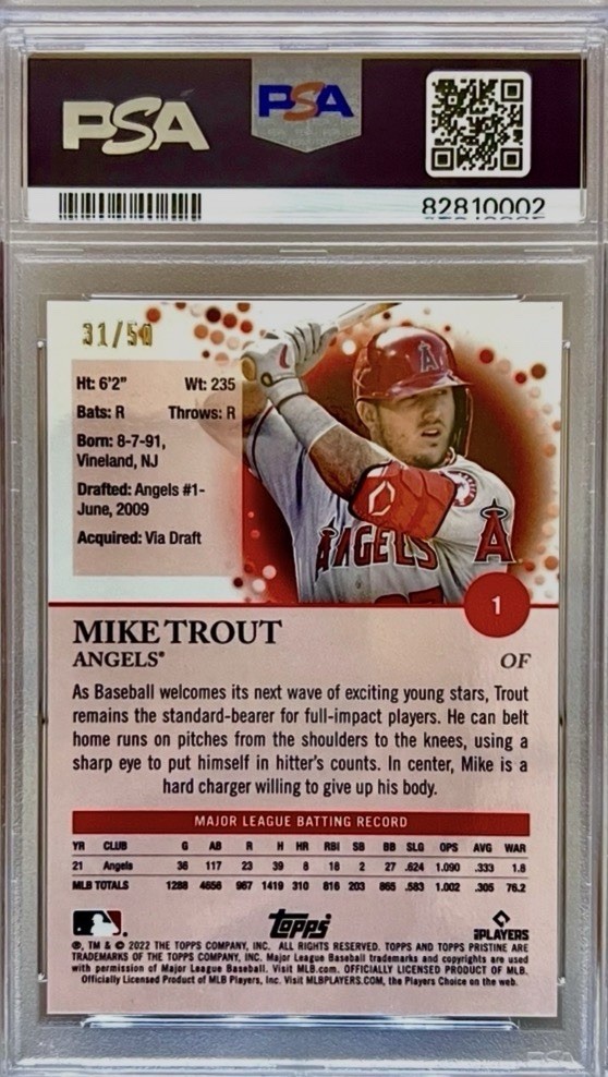 The product is a rare and collectible Mike Trout trading card from the 2022 Topps Pristine set. This specific card is a gold refractor parallel with a limited print run of 31/50. It features the player Mike Trout as the "Yankee Killer" and is NUMBERED AS CARD #1. Manufactured by Topps, the card belongs to the Los Angeles Angels and is a must-have for any baseball card collector.