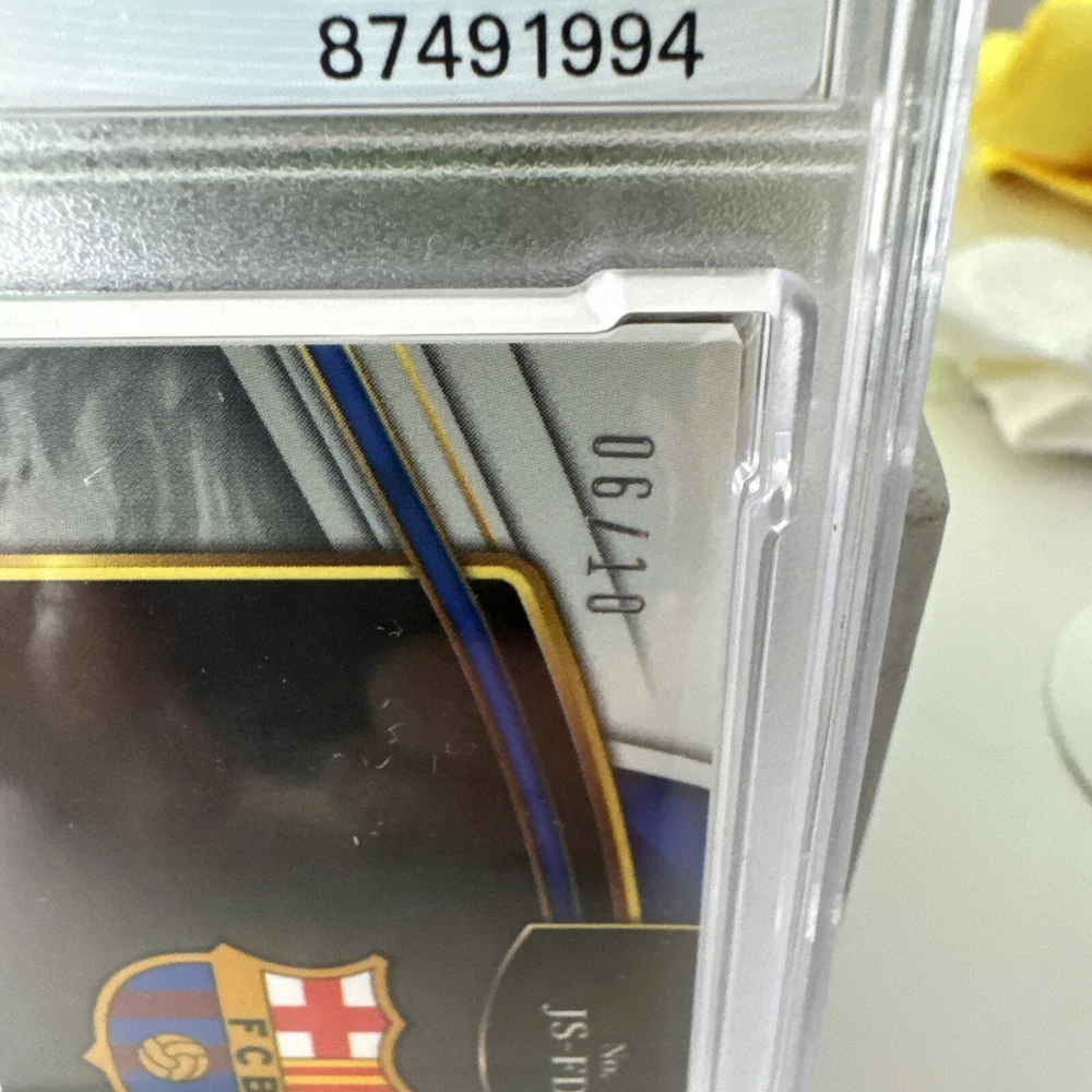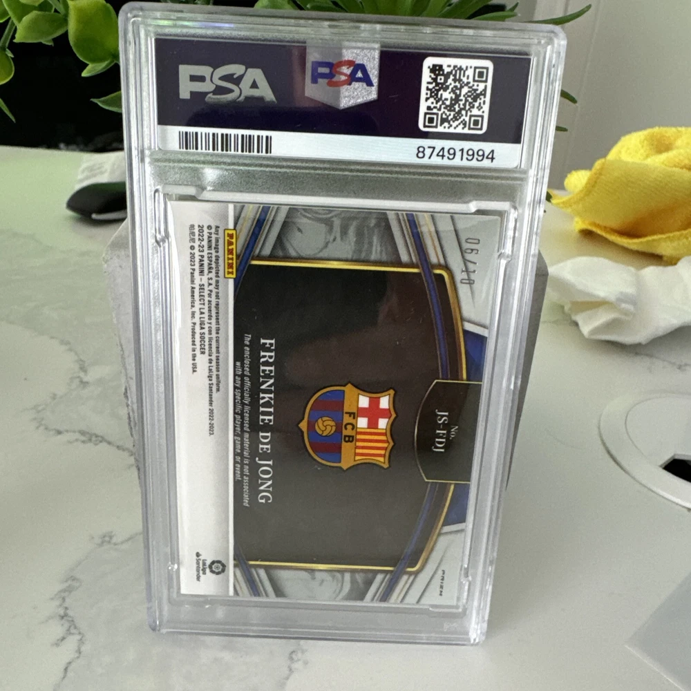2022 PANINI SELECT LA LIGA FRENKIE DE JONG JUMBO SWATCH GOLD /10 MINT PSA 9 - This rare sports trading card features soccer player Frenkie de Jong from La Liga in a limited edition Gold parallel variety. With a Jumbo Swatch design, this card is a must-have for collectors and fans alike. Graded PSA 9, this card is in mint condition and comes with a unique SKU for authenticity. Add this valuable piece to your collection today and showcase your love for the sport and the player. POP1 None higher
