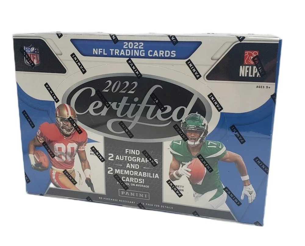 2022 Panini Certified Football - Sealed Hobby Box 10 Packs Per Box - 5 Cards Per Pack 2 Autographs and 2 Memorabilia Card Per Box A cornerstone of the Hobby, Certified Football returns with both classic and brand new short print inserts for the 2022 season! Chase Rookie Patch Autographs from the top rookies from the deep 2022 NFL Draft Class with Freshman Fabric Mirror Signatures, which feature jumbo swatches and a classic design! Be on the look out for brand new short print inserts in 2022 Certified with The Mighty, Certified Stunners and Radical Rookies! Chase unique memorabilia in Piece of the Game and Pieces of the Game Signatures, which feature oversized patches and unique die-cut swatch windows! Find one Freshman Fabric Mirror Signatures or Piece of the Game Signature, in every box! 1 Freshman Fabric Mirror Signatures Or Piece Of The Game Signature 1 Additional Autograph 2 Memorabilia Cards 10 Inserts 2 Rookies Or Rookie Parallels 3 #’D Parallels Base Mirror Collect this 100-card base set that features the top stars that the NFL has to offer! Rookies Hunt for a 100-card rookie set that features the top draft picks from the loaded 2022 rookie class! Autographs: Freshman Fabric Mirror Signatures Find one Freshman Fabric Mirror Signature or Piece of the Game Signature, in every box, on average that features team logos, nameplates and one -of-one NFL shield swatches from your 2022 top rookies! Piece Of The Game Signatures Returning in 2022, Piece of the Game offers collectors a chance to get their hands on some unique memorabilia such as footballs, gloves and jerseys from some of the biggest names that football has to offer in this unique auto set! Canton Certified Signatures Back by popular demand, Canton Certified Signatures gives collectors a chance to get their hands on NFL royalty with a checklist made up of Hall of Fame players! New in 2022, be on the lookout for their micro-etched parallels! Mirror Signatures With a deep 100-card checklist, this autograph set will have a player to collect for everyone! Inserts: 2022 A popular insert within the Certified brand, 2022 returns to showcase the top stars from this year’s loaded freshman class! The Mighty A brand new SP brought into Certified Football, hunt down some of the NFL’s top stars in The Mighty! Certified Stunners Another new SP added into the mix for 2022, be on the lookout for Certified Stunners, featuring the flashiest ballers across the league! PARALLEL APPENDIX: Base: Mirror #’D /349 Mirror Bronze #’D /275 Mirror Pink #’D /199 Mirror Orange #’D /149 Mirror Red #’D /99 Mirror Blue #’D /75 Mirror Teal #’D /50 Mirror Gold #’D /25 Mirror Purple #’D /10 Mirror Green #’D /5 Mirror Black #’D 1/1 Rookies: Mirror #’D /399 Mirror Bronze #’D /325 Mirror Pink #’D /275 Mirror Orange #’D /149 Mirror Red #’D /99 Mirror Blue #’D /75 Mirror Teal #’D /50 Mirror Gold #’D /25 Mirror Purple #’D /10 Mirror Green #’D /5 Mirror Black #’D 1/1 Freshman Fabric Mirror Signatures: Freshman Fabric Mirror Signatures Max #’D //399 Freshman Fabric Mirror Signatures Bronze Max #’D /349 Freshman Fabric Mirror Signatures Pink Max #’D /299 Freshman Fabric Mirror Signatures Orange Max #’D /249 Freshman Fabric Mirror Signatures Red Max #’D/199 Freshman Fabric Mirror Signatures Blue Max #’D /99 Freshman Fabric Mirror Signatures Teal Max #’D /50 Freshman Fabric Mirror Signatures Gold Max #’D /25 Freshman Fabric Mirror Signatures Purple Max #’D /10 Freshman Fabric Mirror Signatures Green Max #’D /5 Freshman Fabric Mirror Signatures Black #’D 1/1 Piece Of The Game Signatures: Piece Of The Game Signatures Max #’D /149 Piece Of The Game Signatures Red Max #’D /99 Piece Of The Game Signatures Teal Max #’D /50 Piece Of The Game Signatures Gold Max #’D /25 Piece Of The Game Signatures Purple Max #’D /10 Piece Of The Game Signatures Green Max #’D /5 Piece Of The Game Signatures Black #’D 1/1 Canton Certified Signatures: Canton Certified Signatures Max #’D /149 Canton Certified Signatures Mirror Red Max #’D /99 Canton Certified Signatures Mirror Blue Max #’D /75 Canton Certified Signatures Mirror Teal Max #’D /50 Canton Certified Signatures Mirror Gold Max #’D /25 Canton Certified Signatures Mirror Purple Max #’D /10 Canton Certified Signatures Mirror Green Max #’D /5 Canton Certified Signatures Mirror Black #’D 1/1 Canton Certified Signatures Red Etch Max #’D /25 Canton Certified Signatures Blue Etch Max #’D /20 Canton Certified Signatures Teal Etch Max #’D /15 Canton Certified Signatures Gold Etch Max #’D /10 Canton Certified Signatures Purple Etch #’D /5 Canton Certified Signatures Green Etch #’D /3 Canton Certified Signatures Black Etch #’D 1/1 Mirror Signatures: Mirror Signatures Max #’D /299 Mirror Signatures Bronze Max #’D /249 Mirror Signatures Pink Max #’D /199 Mirror Signatures Orange Max #’D /149 Mirror Signatures Red Max #’D /99 Mirror Signatures Blue Max #’D /75 Mirror Signatures Teal Max #’D /50 Mirror Signatures Gold Max #’D /25 Mirror Signatures Purple Max #’D /10 Mirror Signatures Green Max #’D /5 Mirror Signatures Black #’D 1/1 2022 2022 Mirror Bronze Max #’D /249 2022 Mirror Pink Max #’D /199 2022 Mirror Orange Max #’D /149 2022 Mirror Red Max #’D /99 2022 Mirror Blue Max #’D /75 2022 Mirror Teal Max #’D /50 2022 Mirror Gold Max #’D /25 2022 Mirror Purple Max #’D /10 2022 Mirror Green Max #’D /5 2022 Mirror Black #’D 1/1