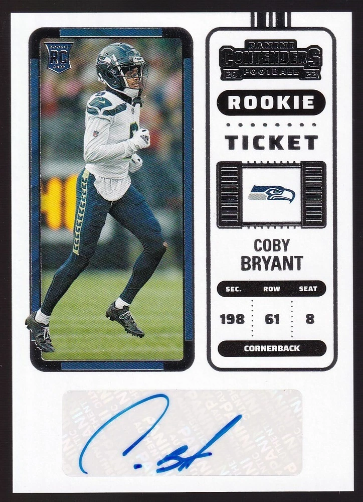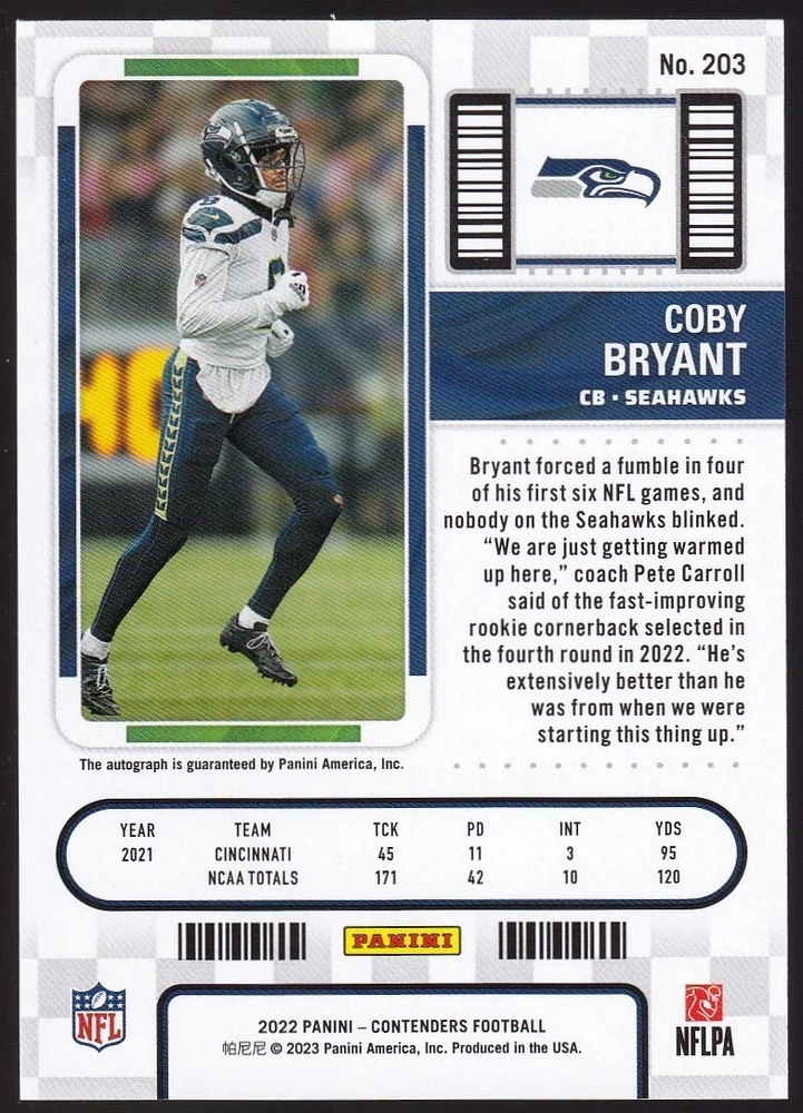 Team: Seattle Seahawks Signed By: Coby Bryant Set: 2022 Panini Contenders Sport: Football Autograph Authentication: Panini Authentic Features: Auto, Rookie Autograph Format: Label or Sticker League: National Football League (NFL) Player/Athlete: Coby Bryant Season: 2022 Autographed: Yes Card Number: 203 Manufacturer: Panini