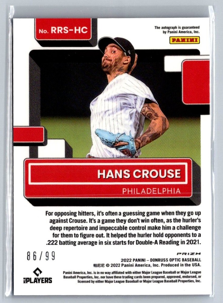 Year Manufactured: 2022 Features: Hologram, Insert, Parallel/Variety, Rookie, Serial Numbered Season: 2022 League: Major League (MLB) Set: 2022 Panini Donruss Optic Manufacturer: Panini America, Inc. Player/Athlete: Hans Crouse Card Name: Blue Mojo Prizm Signed By: Hans Crouse Autograph Authentication: Panini Authentic Team: Los Angeles Angels, Philadelphia Phillies Autographed: Yes Sport: Baseball Type: Sports Trading Card Parallel/Variety: Blue Mojo Prizm Card Number: RRS-HC