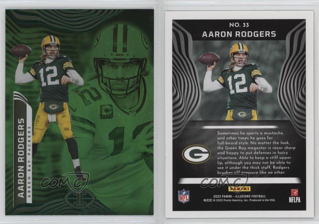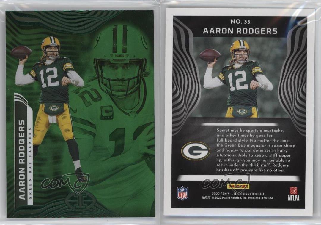 Original/Reprint: Original Graded: No Year: 2022 Player/Athlete: Aaron Rodgers Type: Sports Trading Card Sport: Football Grade: Ungraded Set: 2022 Panini Illusions - [Base] - Trophy Collection Emerald Year Manufactured: 2022 Product: Single-Parallel Franchise: N/A Athlete: Aaron Rodgers Team: Green Bay Packers Season: 2022 Parallel/Variety: Trophy Collection Emerald Card Name: Aaron Rodgers Card Number: 33 Manufacturer: Panini America, Inc. Card Manufacturer: Panini America, Inc. Player: Aaron Rodgers Professional Grader: None