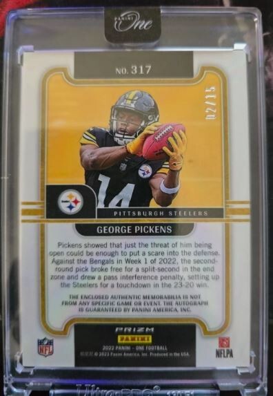 Elevate your football memorabilia collection with the 2022 Panini One George Pickens Gold Auto Patch card, a sought-after gem for any enthusiast or fan of the Pittsburgh Steelers. This exclusive card features a vibrant gold patch and an authentic autograph by George Pickens, hard-signed directly on the card, with authentication by Panini Authentic.Limited to just 15 pieces, this card is serial numbered 2 of 15, ensuring its rarity and collectible value. The card is a rookie piece from the 2022 NFL season and showcases a standard card size, perfect for display or storage. It's a must-have for those who appreciate the legacy and excitement of football and the craftsmanship of Panini sports trading cards.