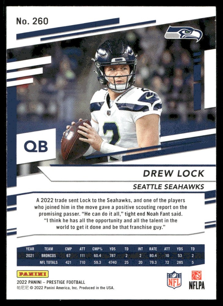 About Me Other Listings Feedback Add to Favorites Contact Me eBay Store JEm_Mint_Trading 2022 Panini Prestige Drew Lock Seattle Seahawks #260 No stock photo / These are real scans or pictures Details Description: Drew Lock Category: Football Year: 2022 Product: Panini Prestige Team: Seattle Seahawks Card Number: 260 Dimensions: 3½" x 2½" SKU: FT A0016 R01 M (12) Listing By Kronocard trading cards software v2.8.2.3
