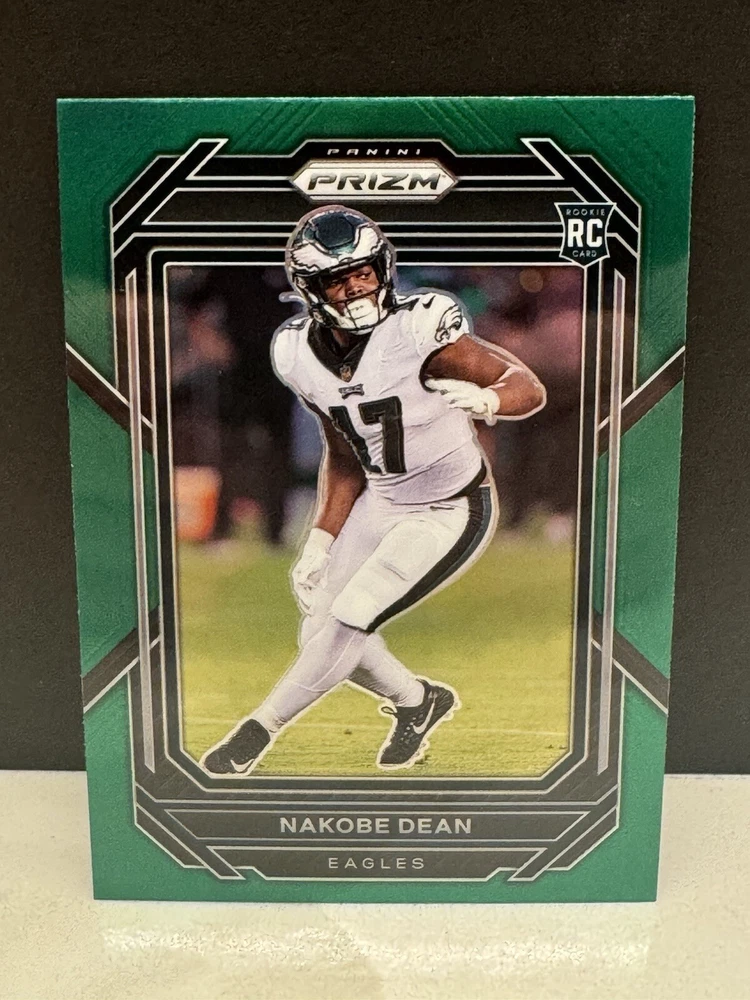 The 2022 Panini Prizm Nakobe Dean Rookie Card (#399) features Nakobe Dean, a player for the Philadelphia Eagles in the National Football League (NFL). This sports trading card is part of the Panini Prizm series, known for its high-quality cards and vibrant designs. The card is in near mint or better condition, making it a desirable collectible for football fans and trading card enthusiasts looking to add a rookie card of Nakobe Dean to their collection.